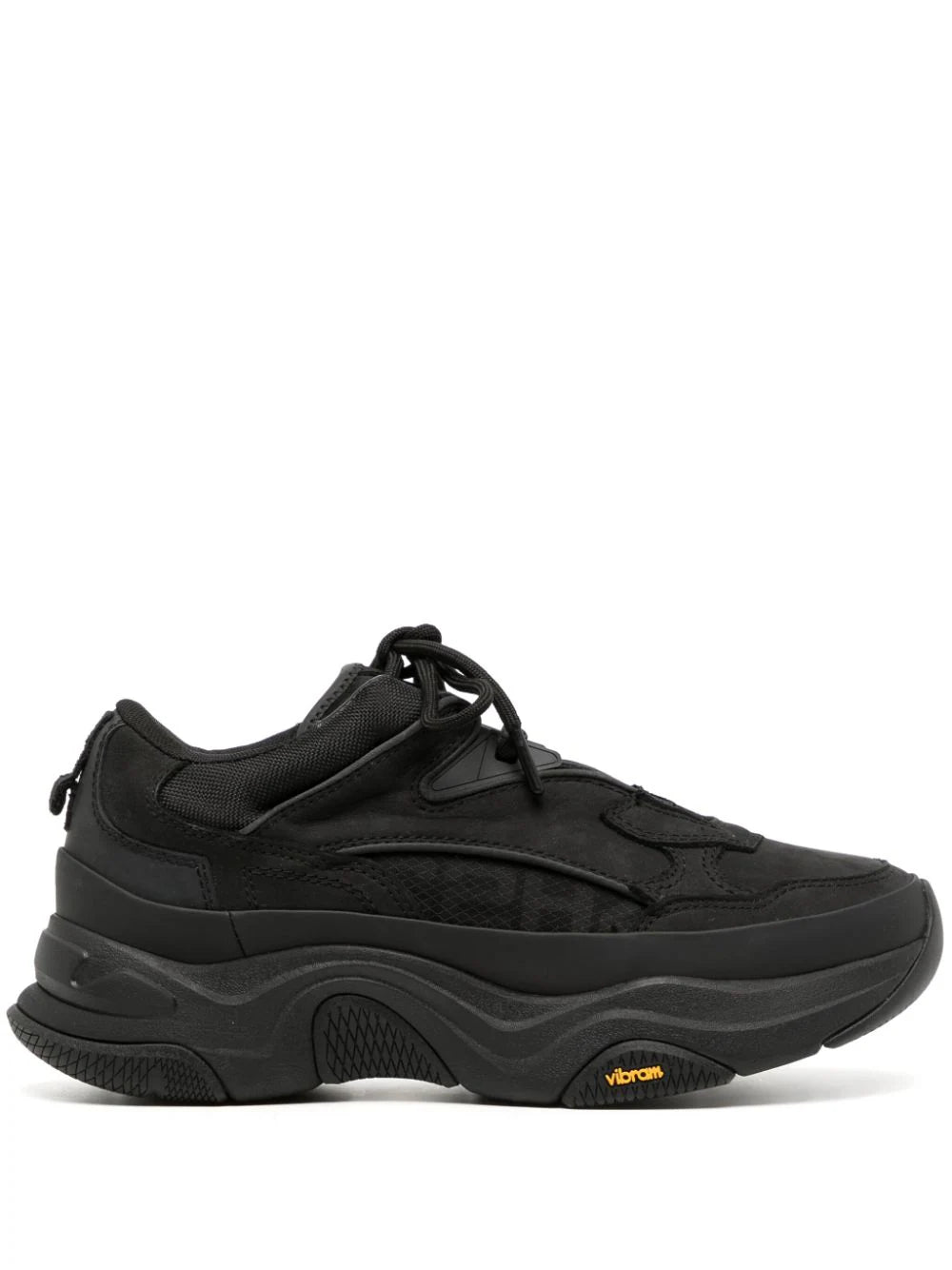 Quark Alpha panelled sneakers from C2H4 featuring black, calf leather, panelled design, suede panelling, logo print to the side, round toe, front lace-up fastening, pull-tab at the heel and chunky rubber sole.