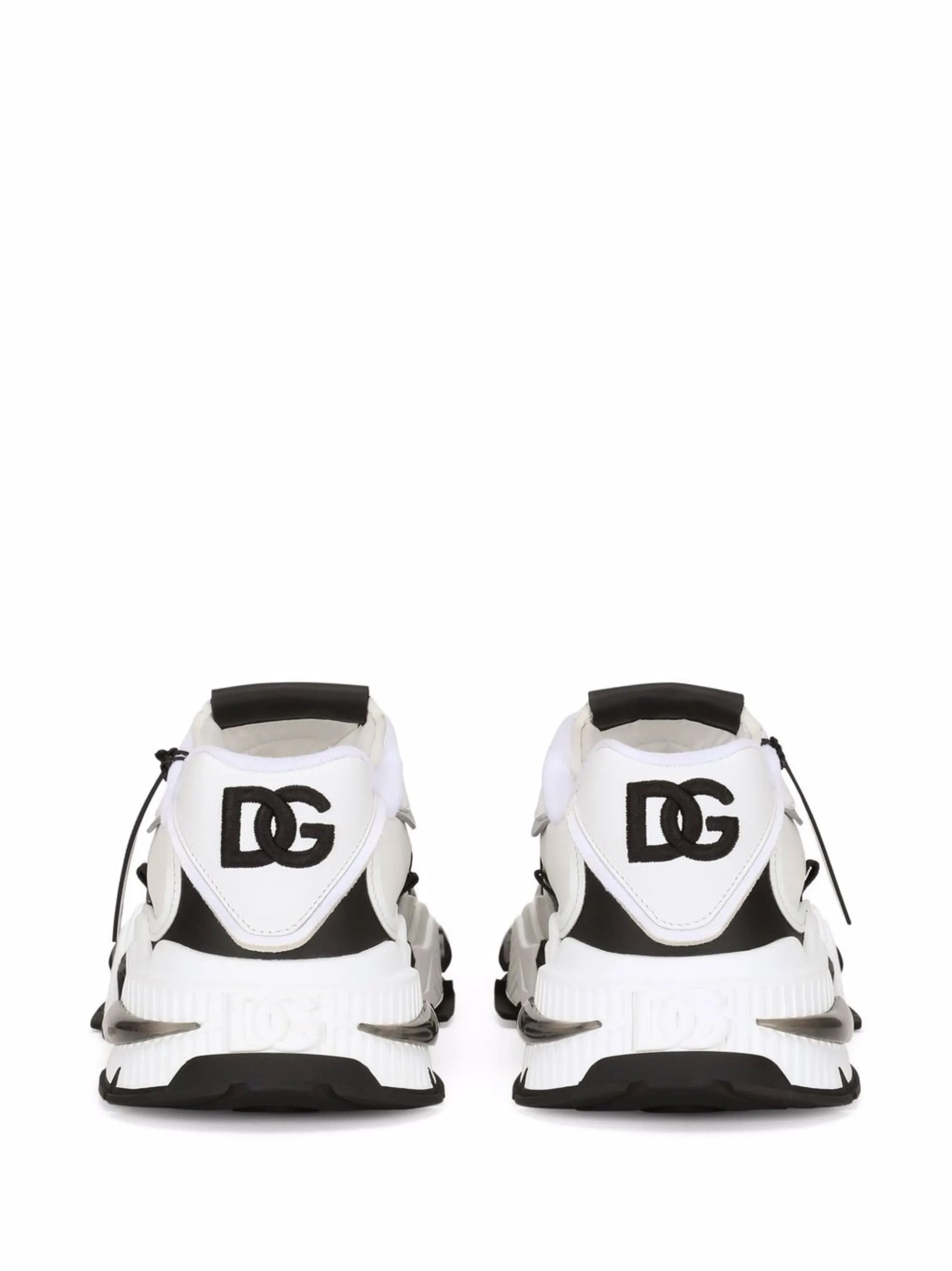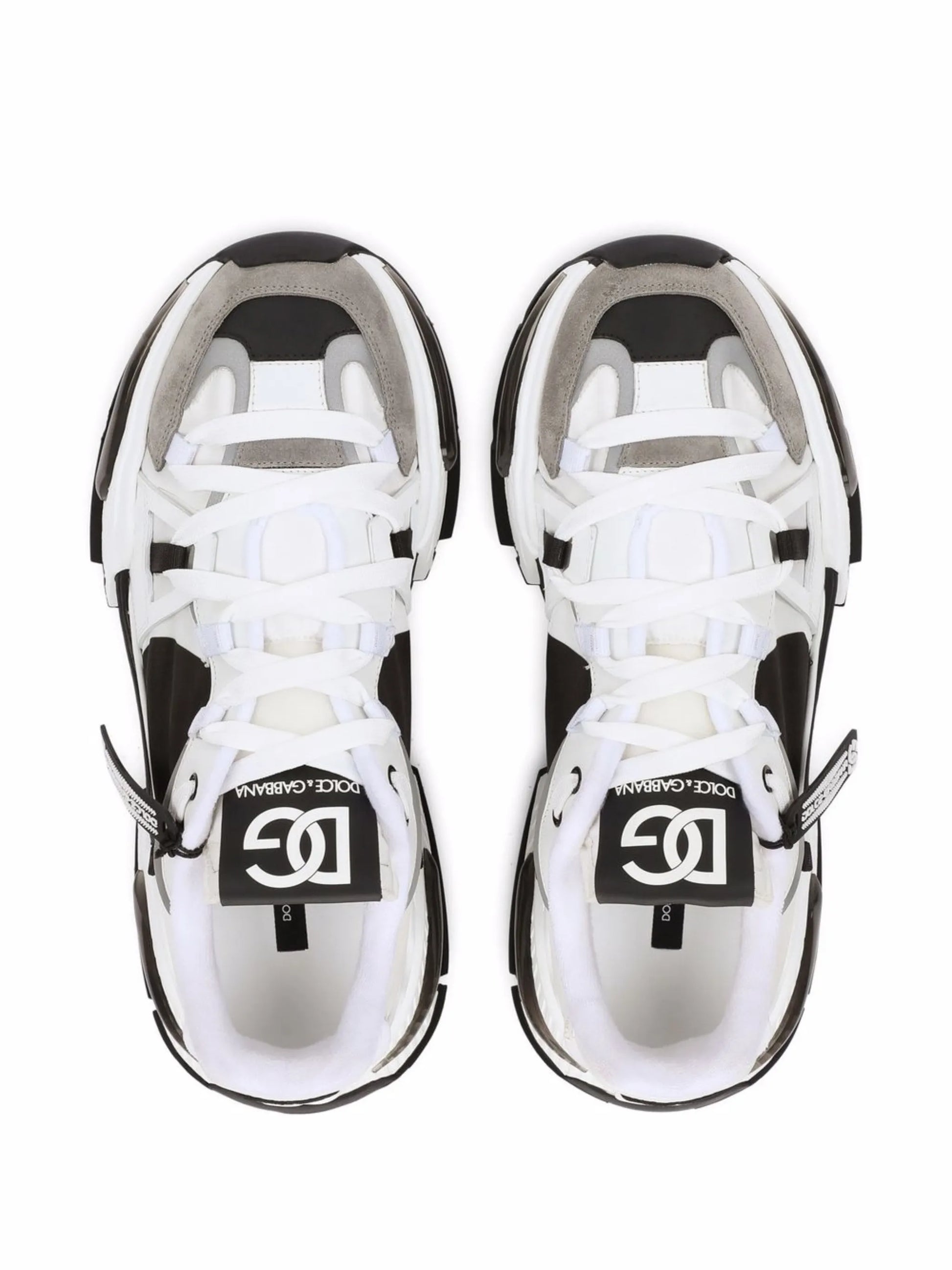 The Dolce & Gabbana Airmaster Panelled Sneakers exemplify luxury sportswear craftsmanship. Constructed from premium calf leather and supple lambskin in white, grey, and black, the distinctive panelled design creates visual depth and contemporary appeal. A signature logo patch adorns the tongue, whilst the round toe silhouette and front lace-up fastening deliver classic sneaker proportions. The chunky rubber sole provides substantial grip and durability, making these low-tops an investment piece that balances refined aesthetics with everyday wearability.