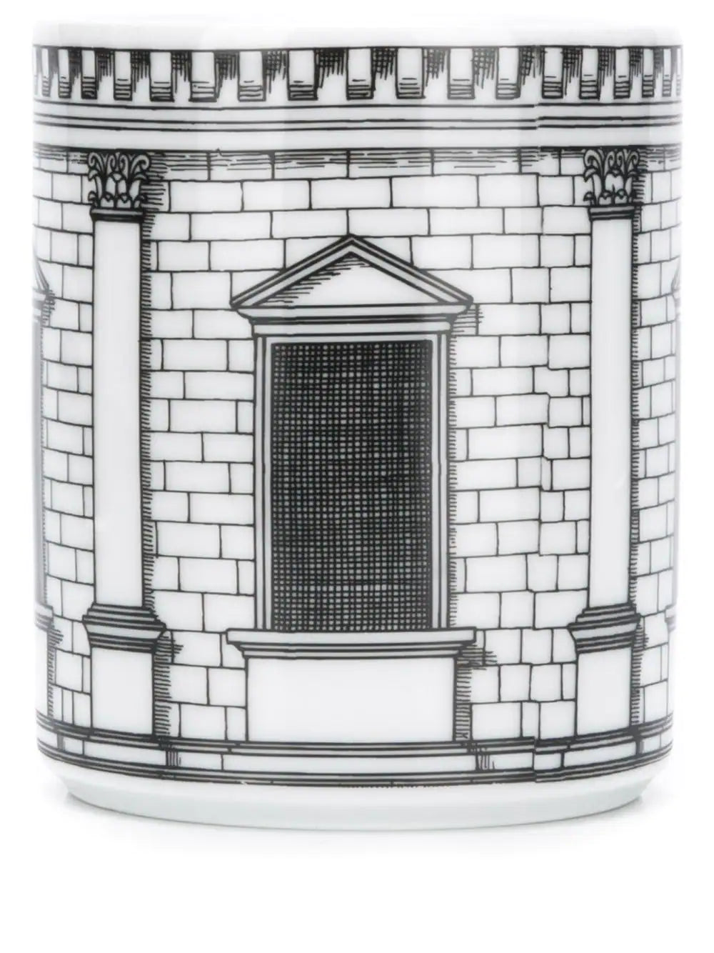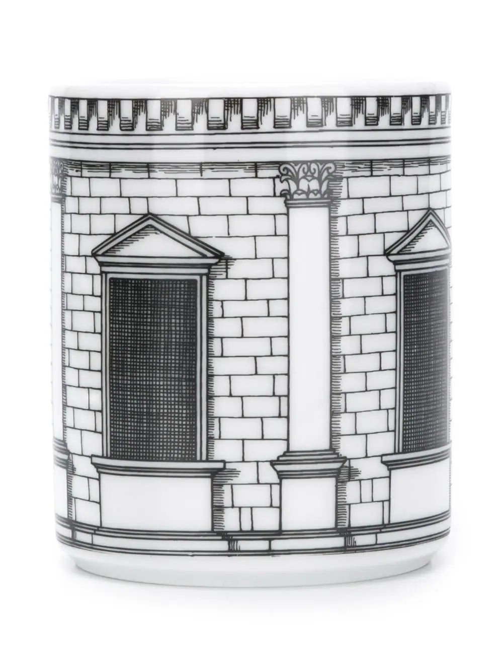 Black/white porcelain Architettura-print pencil holder from FORNASETTI featuring round face and geometric print.