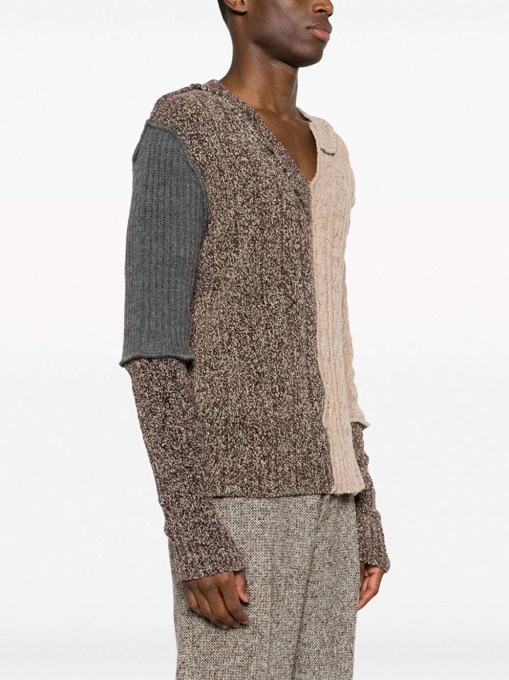 asymmetric-neck patchwork jumper from DOLCE & GABBANA featuring brown, multicolour, wool-cotton blend, knitted construction, patchwork design, asymmetric neck, drop shoulder, long sleeves and ribbed cuffs and hem.
