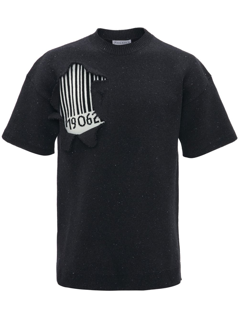 barcode-print short-sleeved sweatshirt from JW Anderson featuring dark grey, white, recycled cotton, cotton blend, barcode print, distressed effect, crew neck, short sleeves and straight hem.