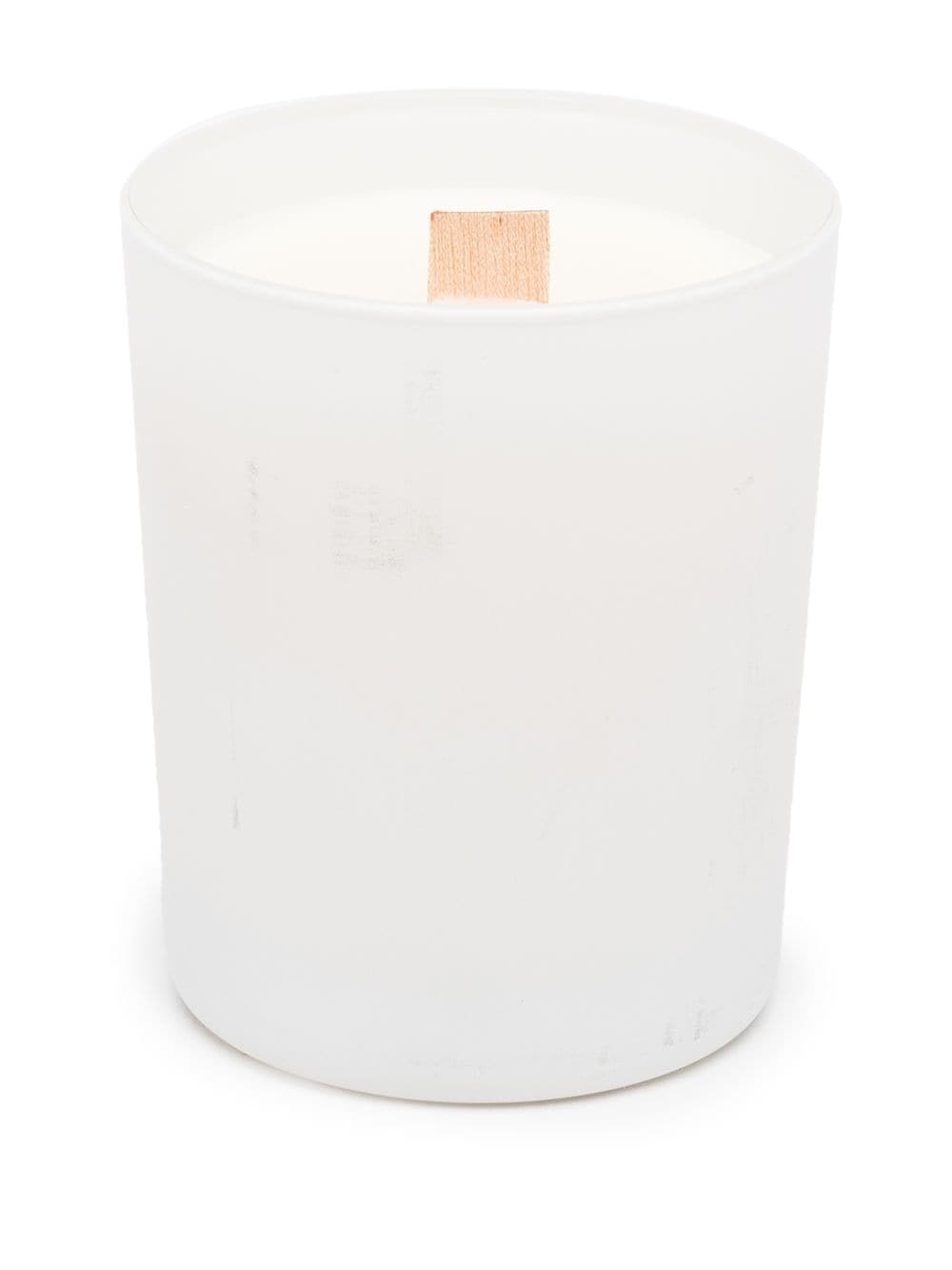 White wax Blaise Mautin scented candle from visvim featuring round frame, single wooden wick and top lid.
