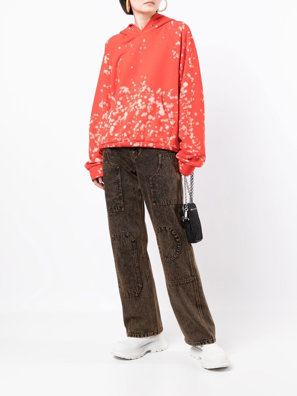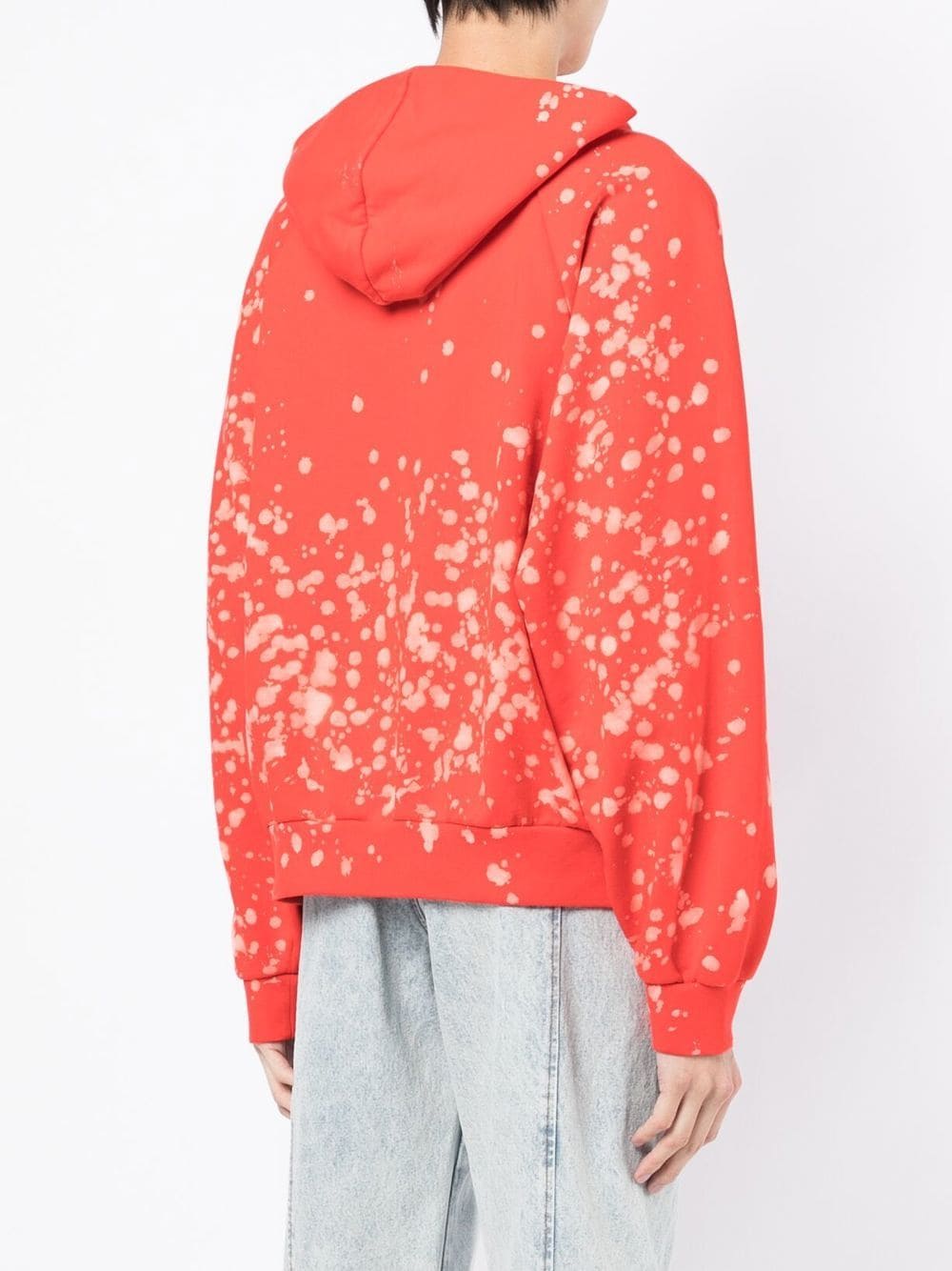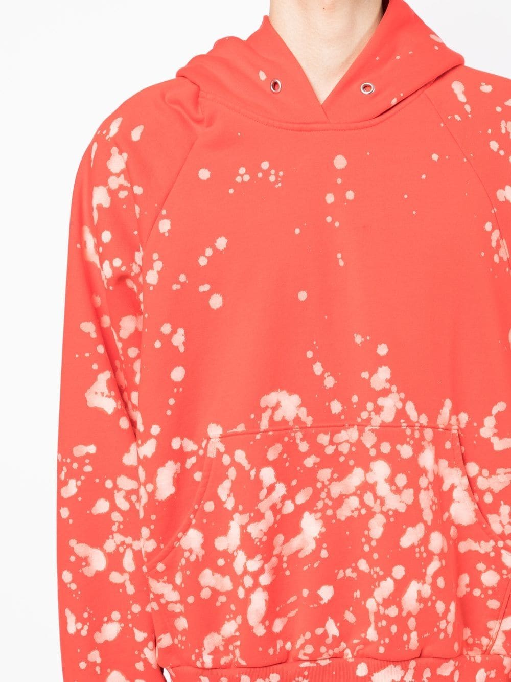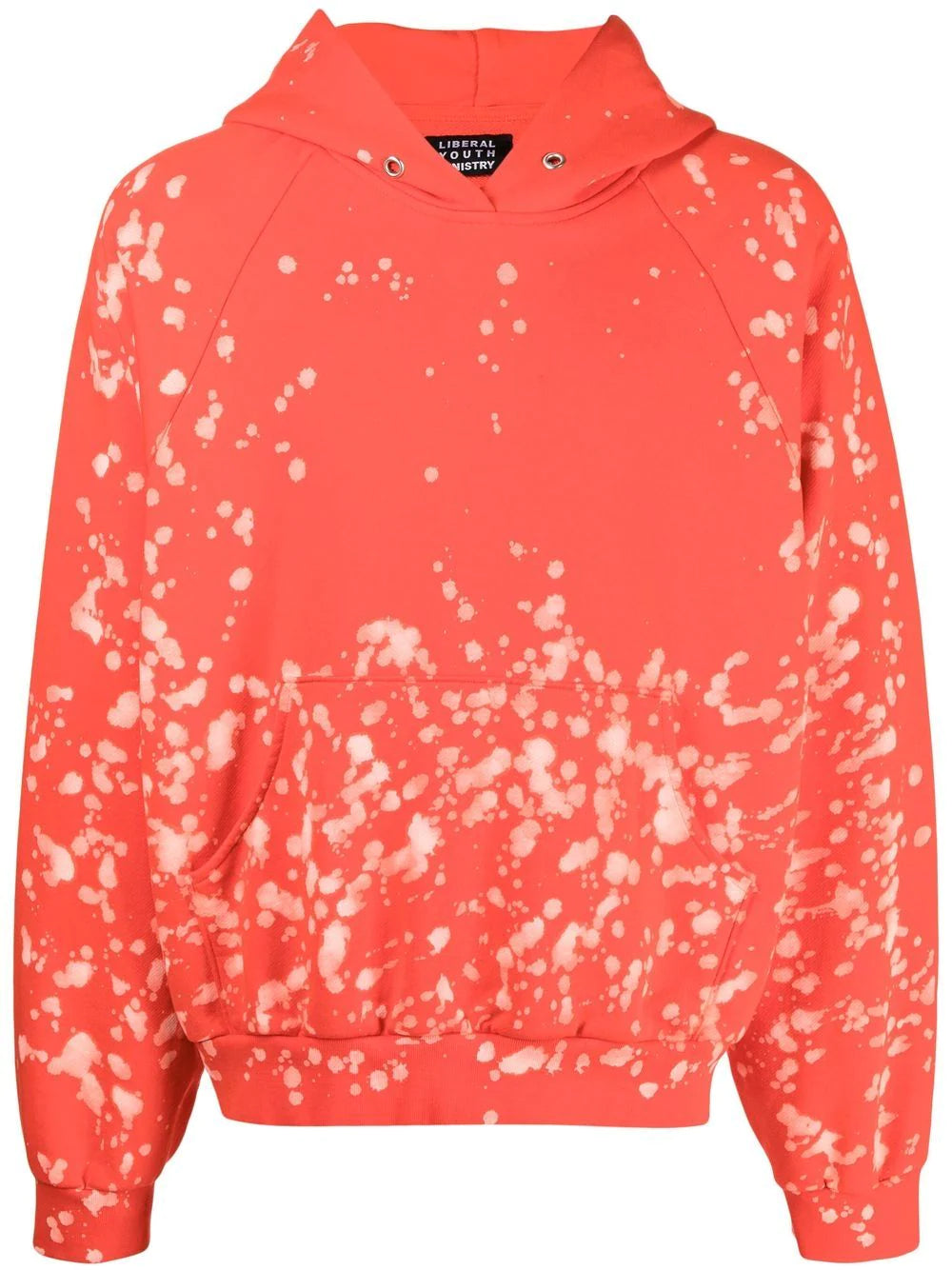 bleach-splash cotton hoodie from Liberal Youth Ministry featuring light red, cotton, classic hood, long sleeves, straight hem, front pouch pocket and bleach-splash effect.