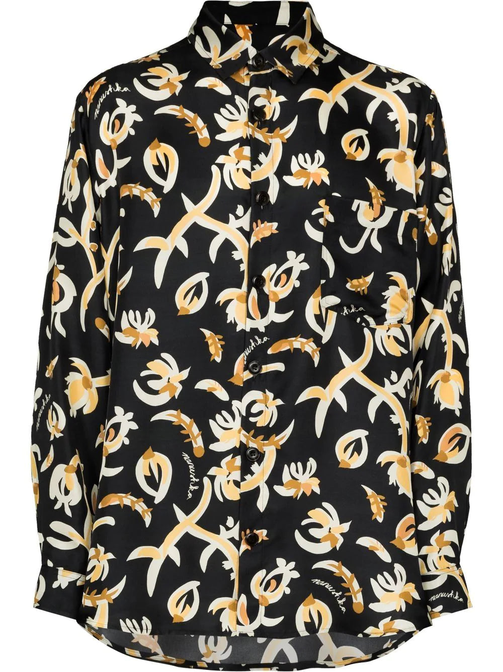 Bodil long-sleeved shirt from NANUSHKA featuring black, cotton, abstract pattern print, straight-point collar, front button fastening, long sleeves, buttoned cuffs, chest patch pocket and curved hem.