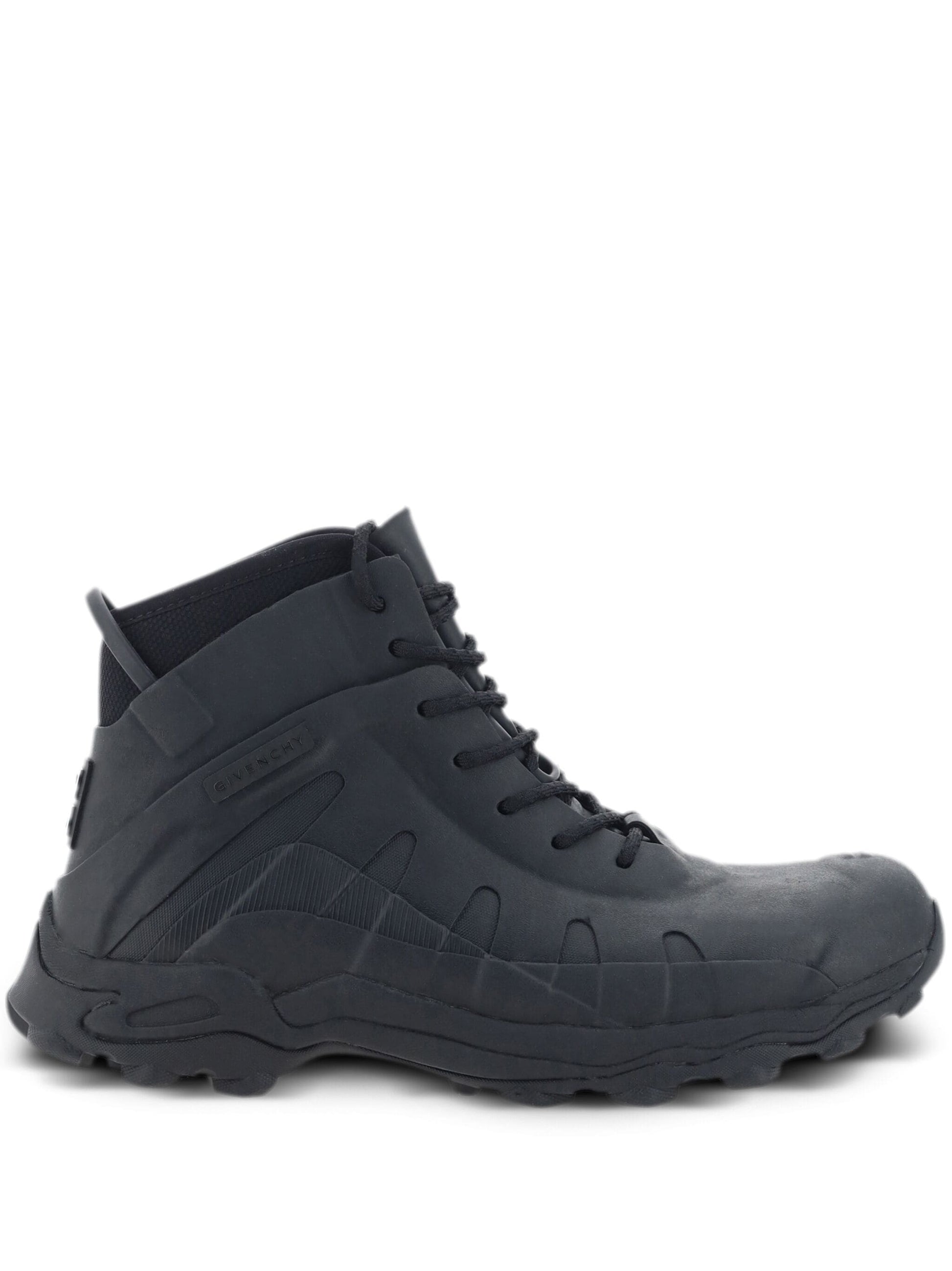 black waterproof front lace-up fastening branded heel counter pull-tab at the heel ankle-length embossed logo to the side round toe branded insole mesh lining vulcanised-rubber sole