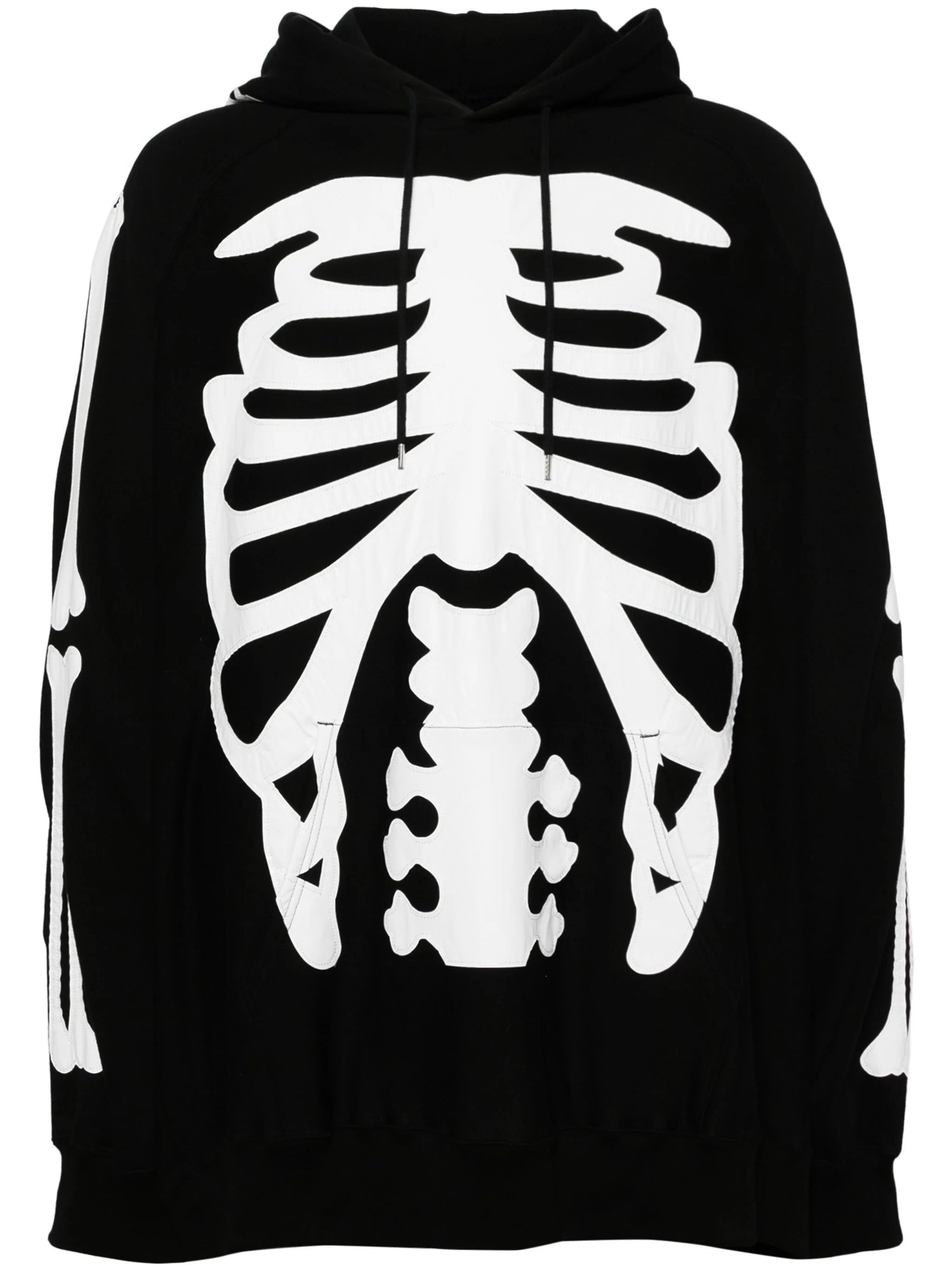 black/white cotton blend bone patch two-tone design slouchy drawstring hood long sleeves front pouch pocket ribbed cuffs and hem