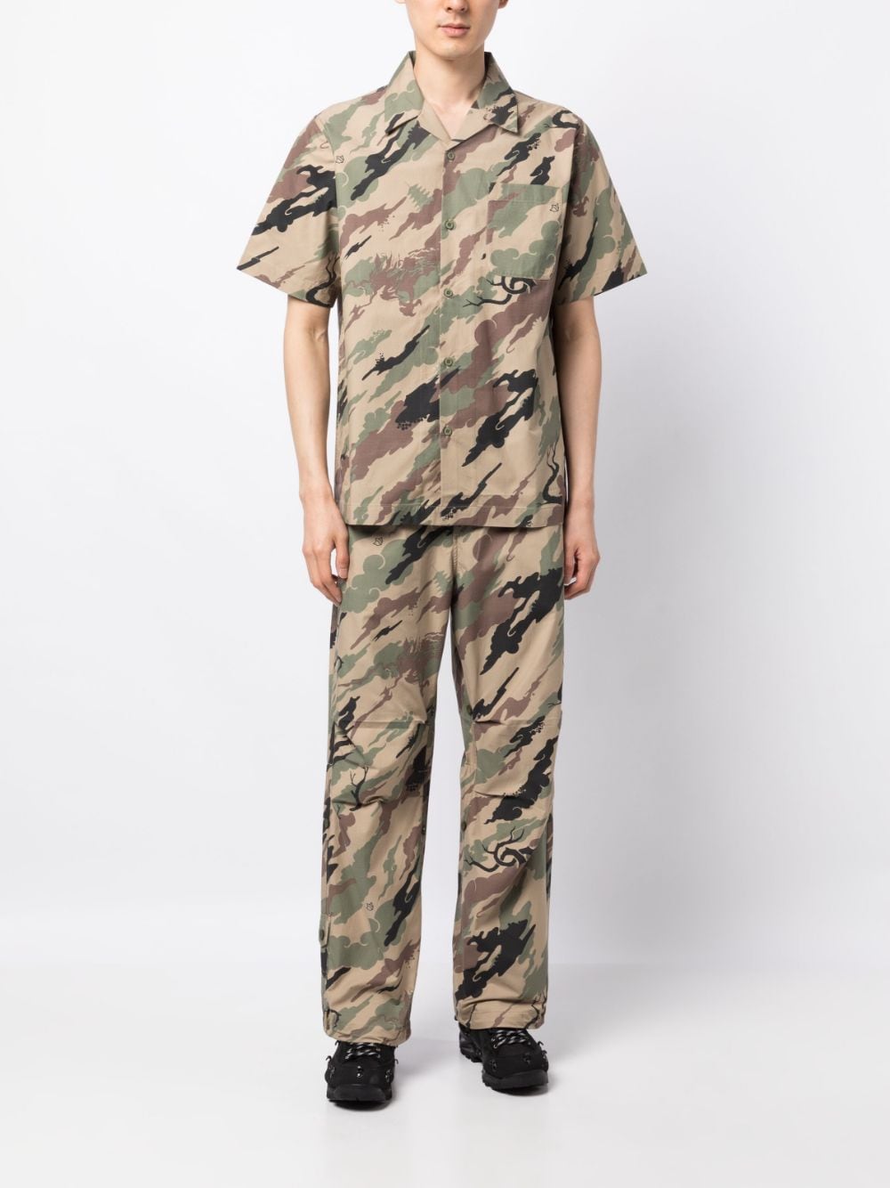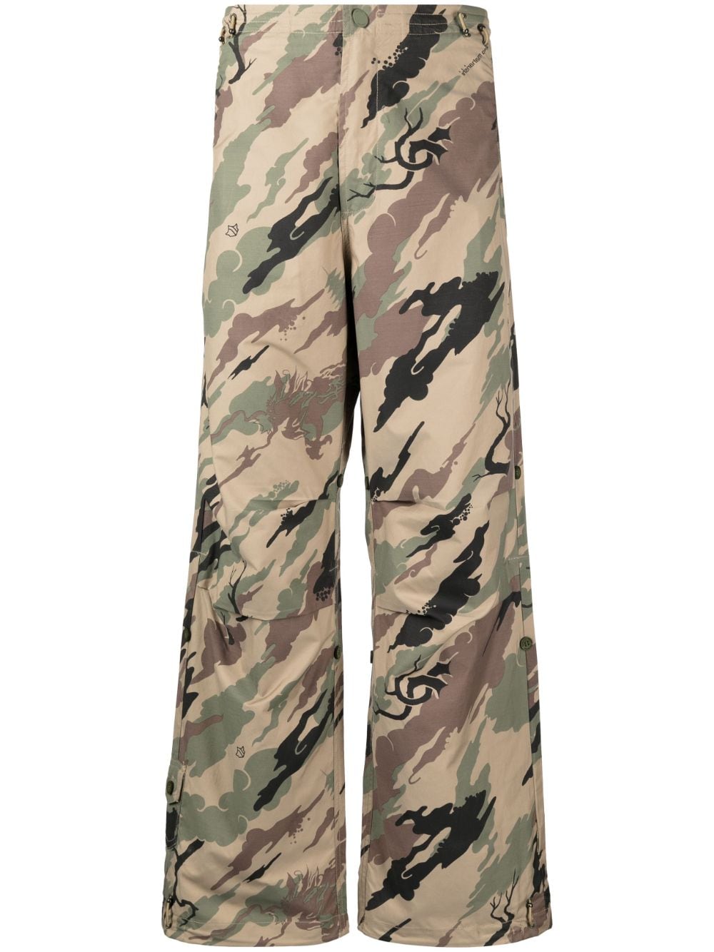 Bonsai Forest-print trousers from MAHARISHI featuring khaki, multicolour, organic cotton-recycled polyester blend, camouflage pattern, dart detailing, front button and zip fastening, elasticated waistband, elasticated ankles, two side inset pockets, side zip-fastening pocket, side flap pocket, two rear flap pockets, water-repellent and straight leg.
