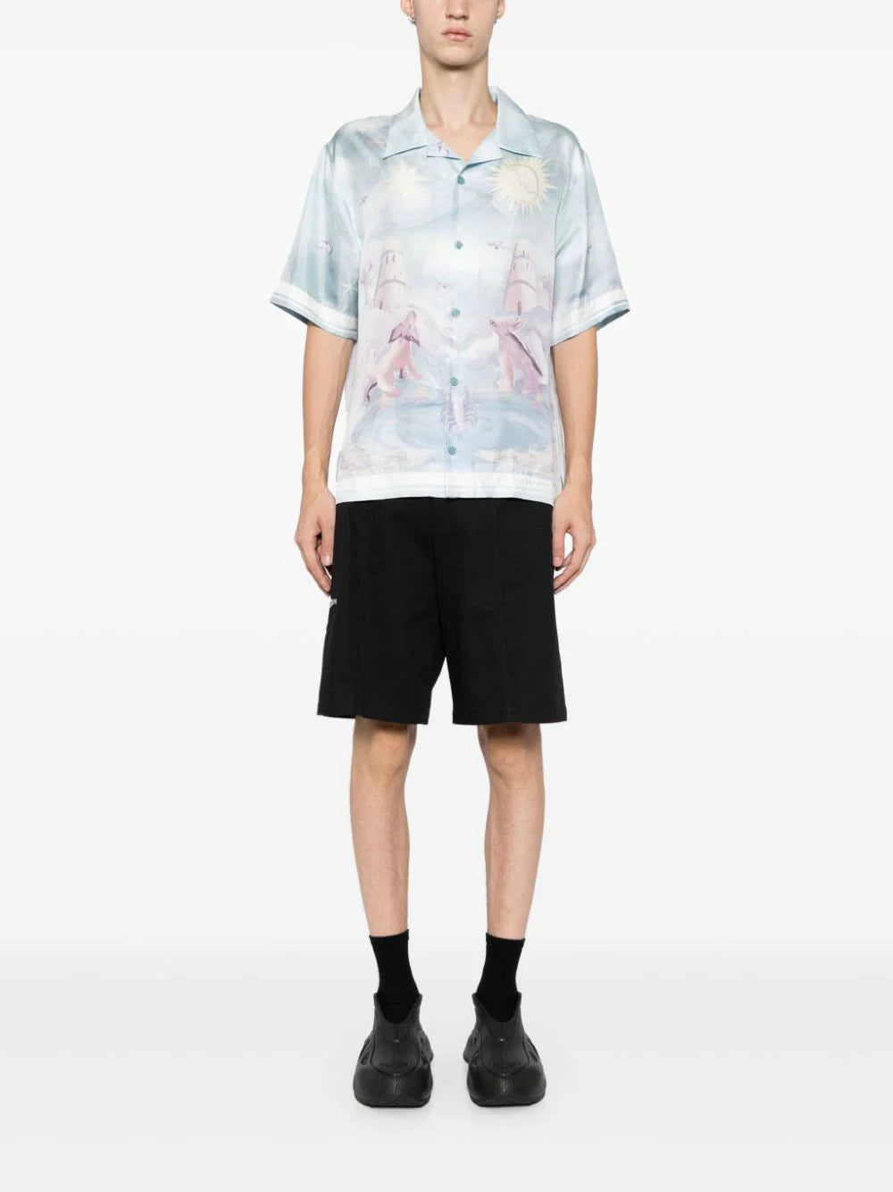 blue/multicolour silk front button fastening graphic print Cuban collar short sleeves short side slits straight hem
