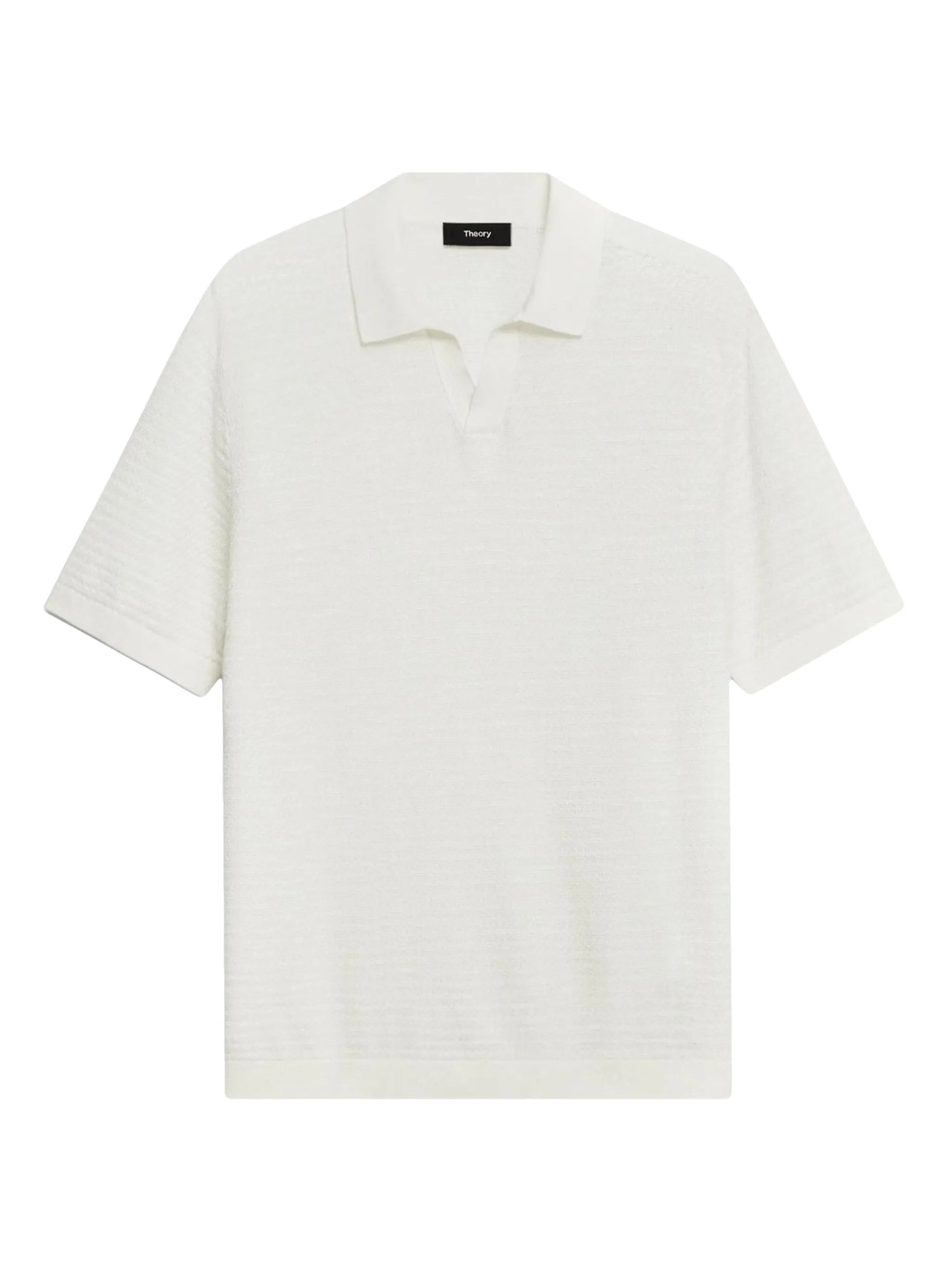 This white Brenan Polo Shirt exemplifies refined casual wear with its classic polo collar and short sleeves. The subtle textured pattern elevates its sophisticated appearance, while the ribbed hem ensures a tailored silhouette. Expertly crafted for versatility, it transitions seamlessly from business casual to weekend attire with uncompromising style.