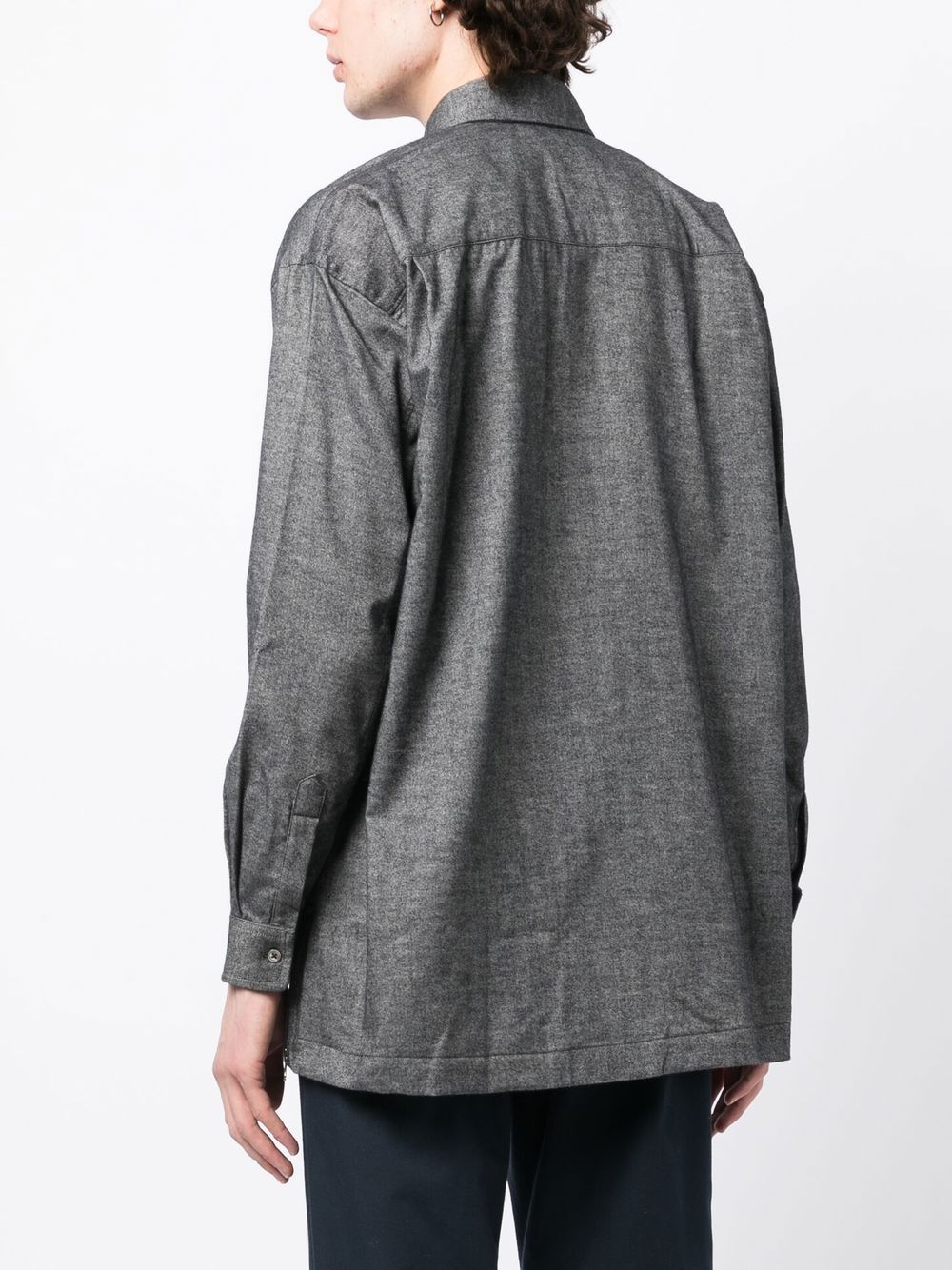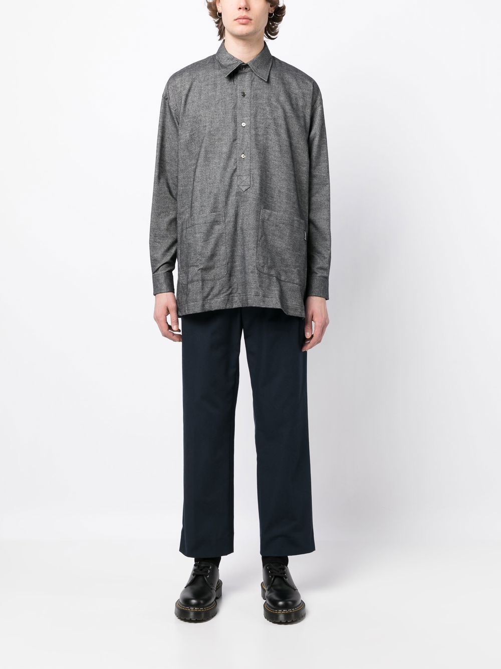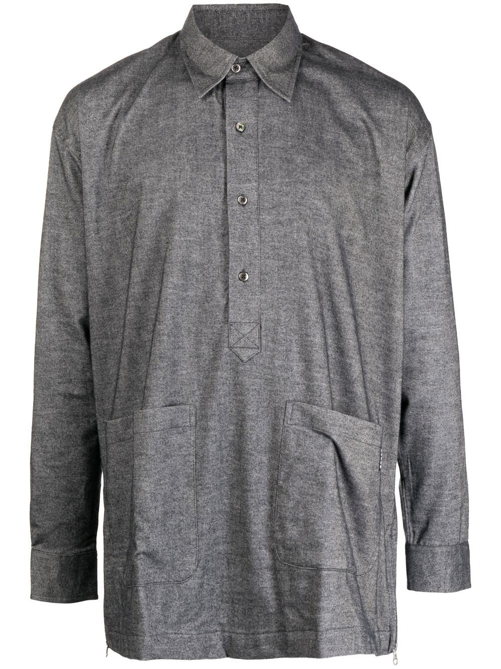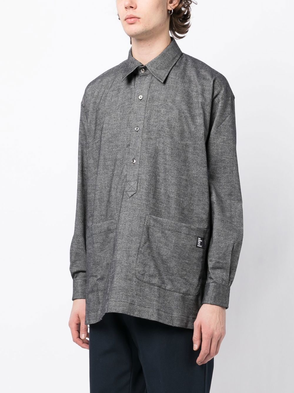 button placket long-sleeve shirt from The Power For The People featuring grey, cotton, logo patch to the side, classic collar, front button placket, long sleeves and two front pouch pockets.