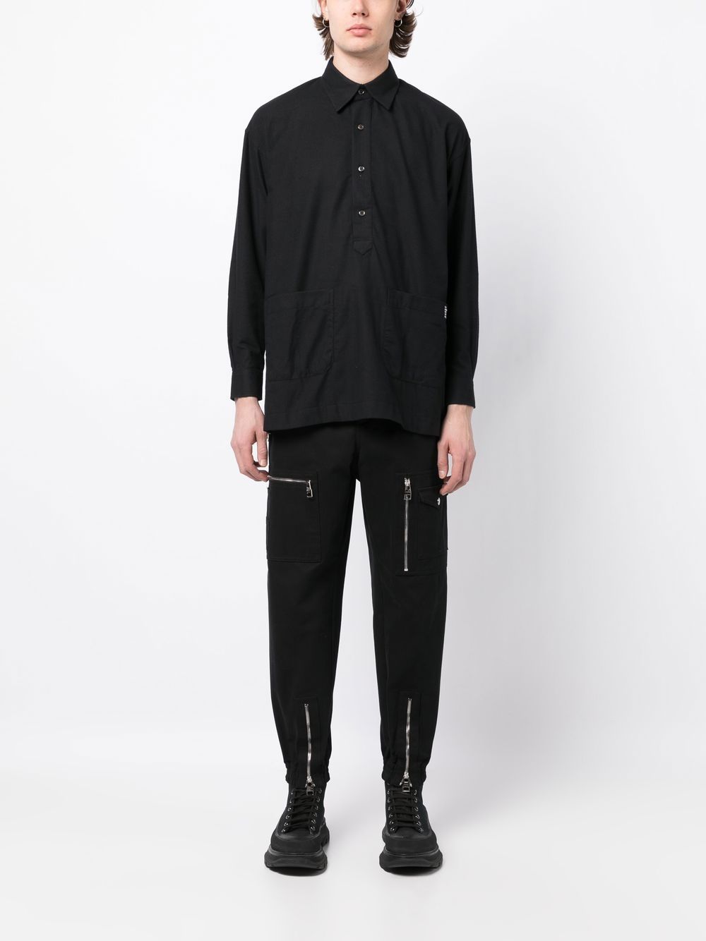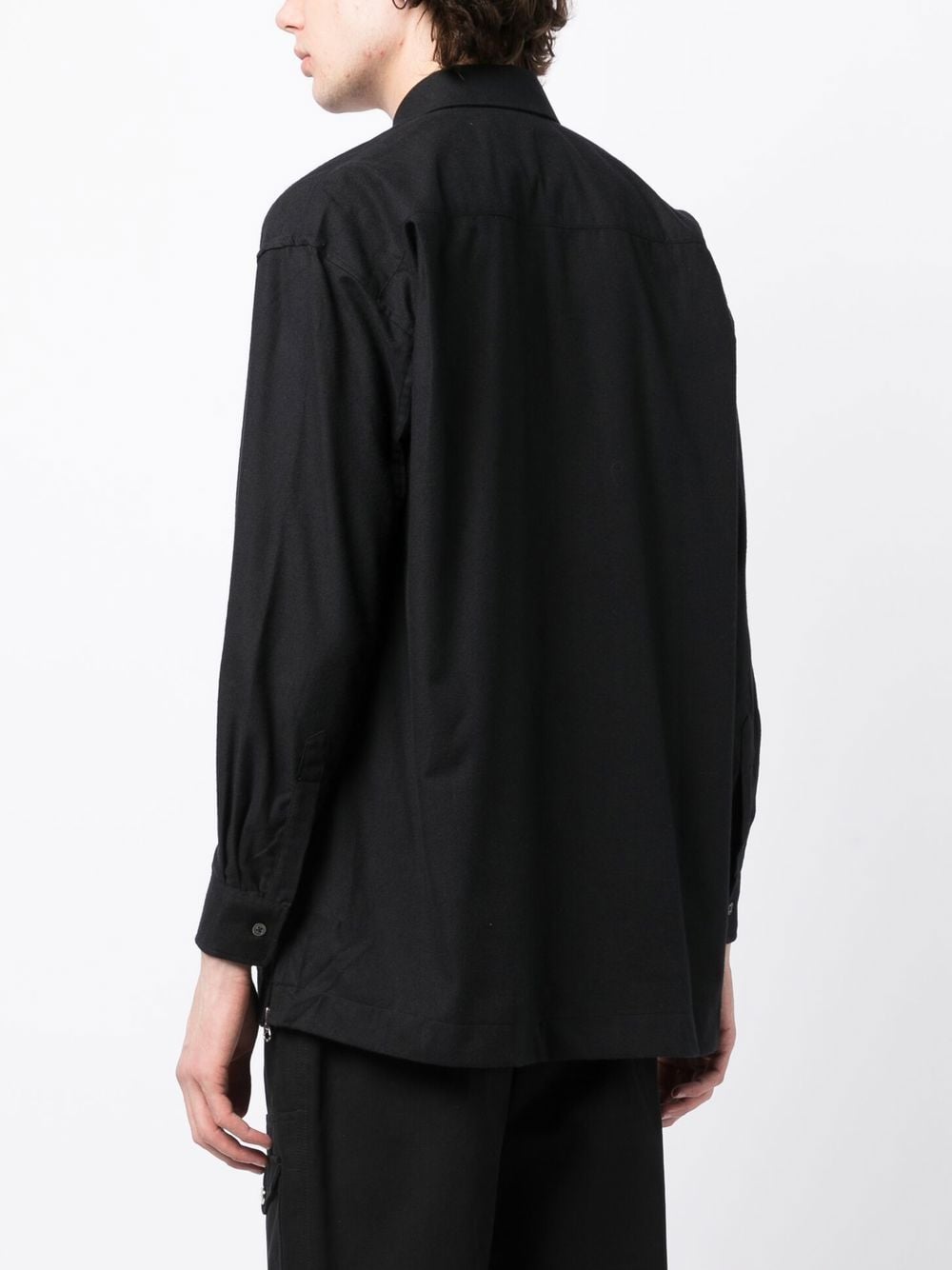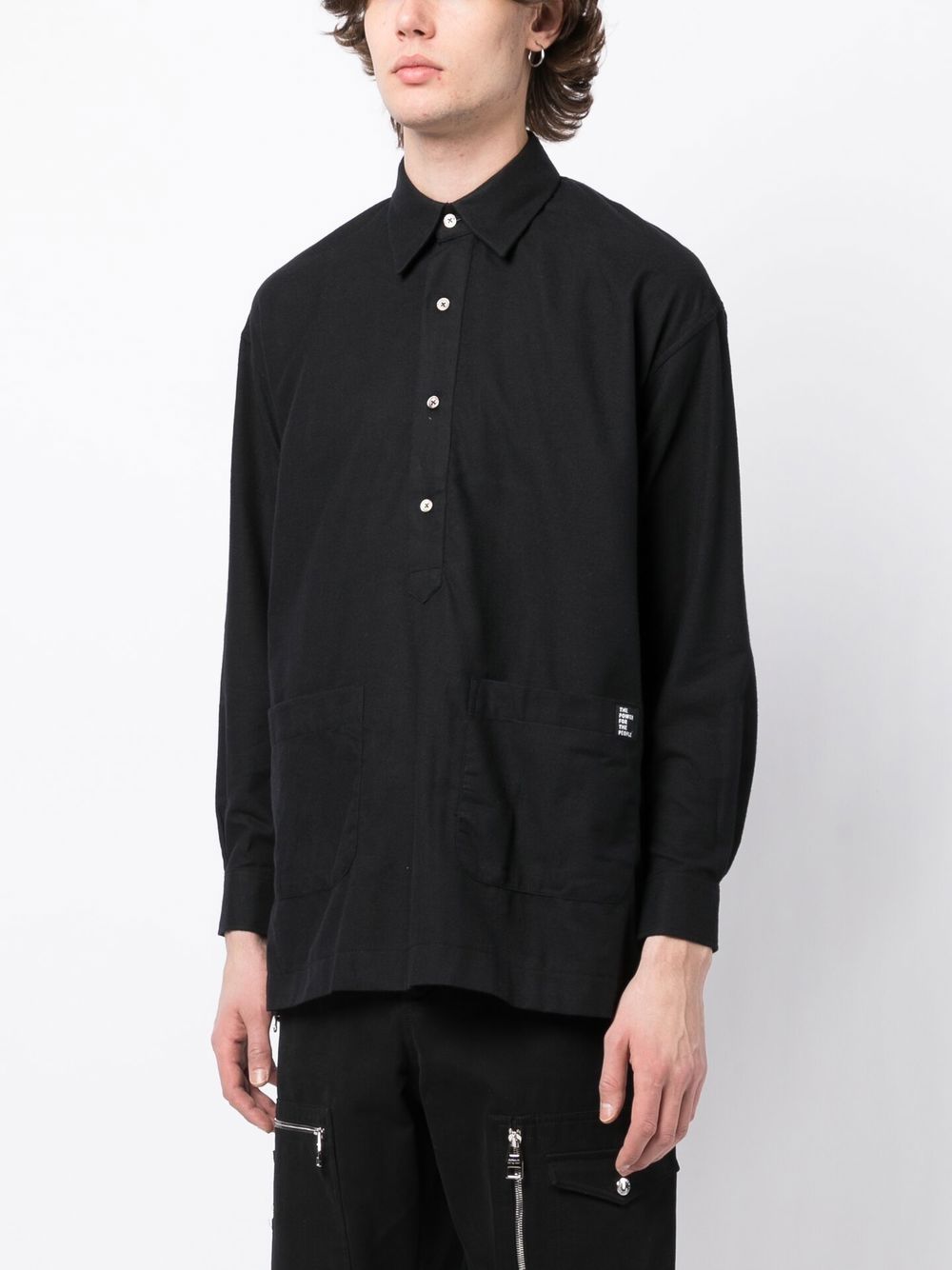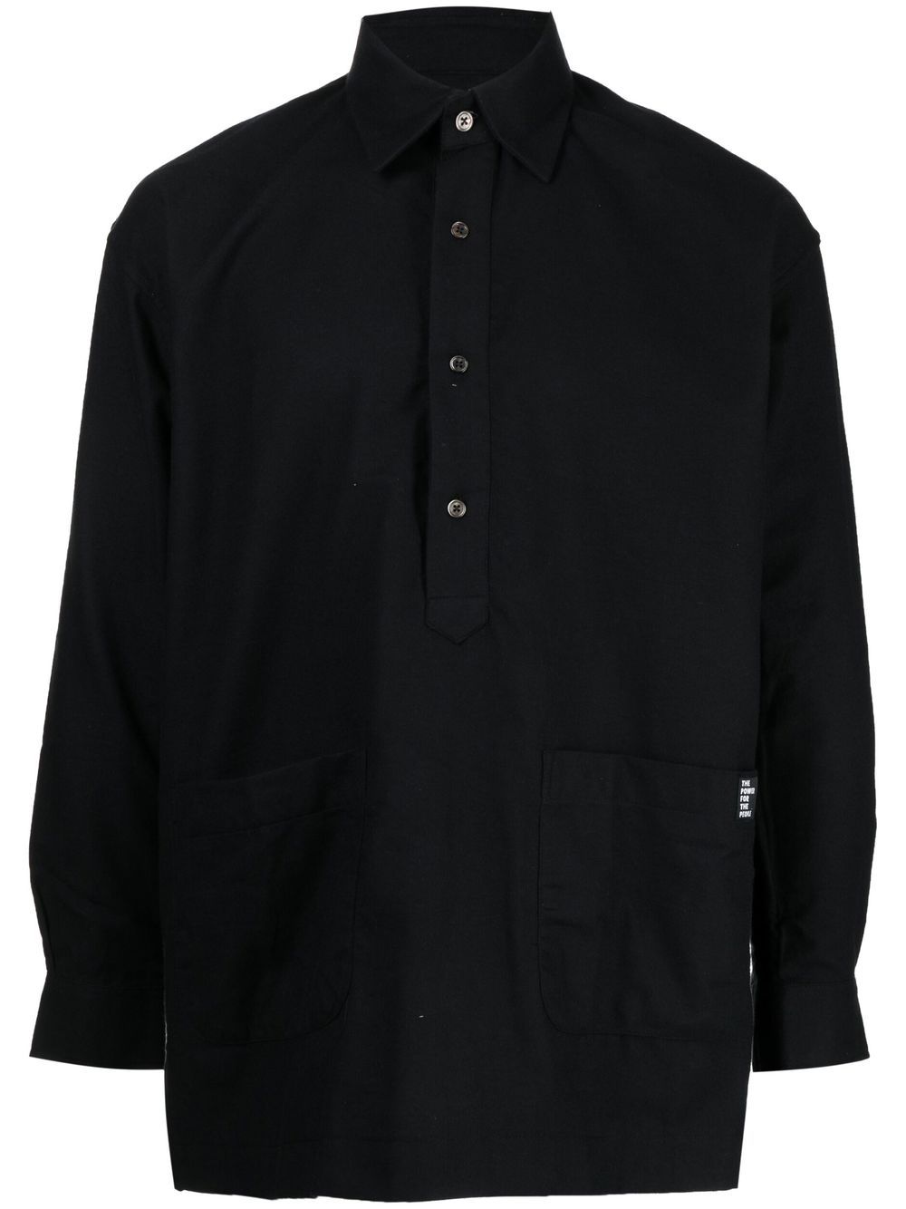 button placket long-sleeve shirt from The Power For The People featuring black, cotton, logo patch to the side, classic collar, front button placket, long sleeves and two front pouch pockets.