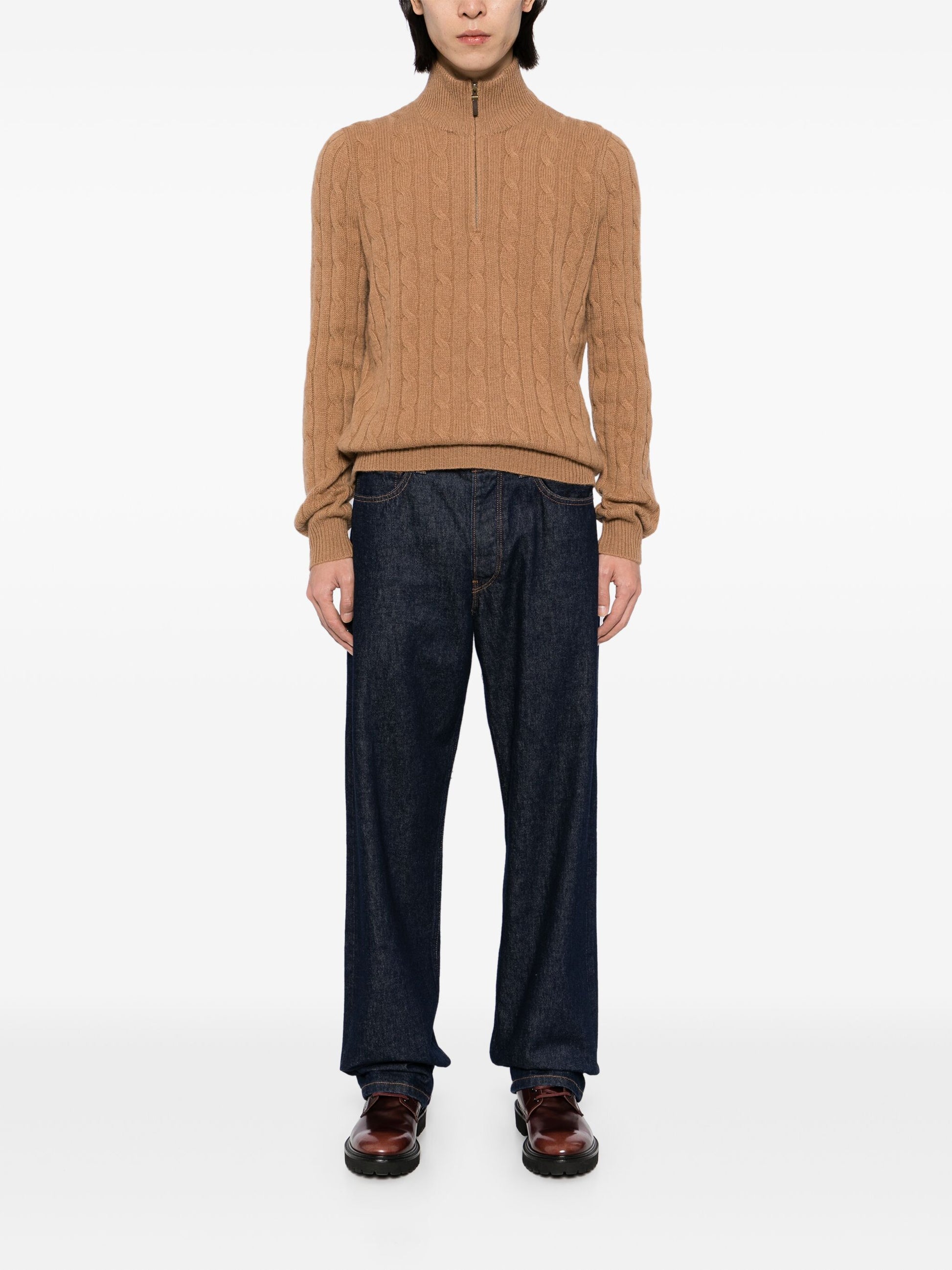 Expertly crafted for warmth and style, our Cable-Knit Quarter-Zip Sweater is a must-have for any wardrobe. Made with a luxurious brown high neck knitted construction, long sleeves, and ribbed cuffs and hem, this sweater offers both comfort and sophistication. Stay cozy and fashionable all season long with this essential piece.