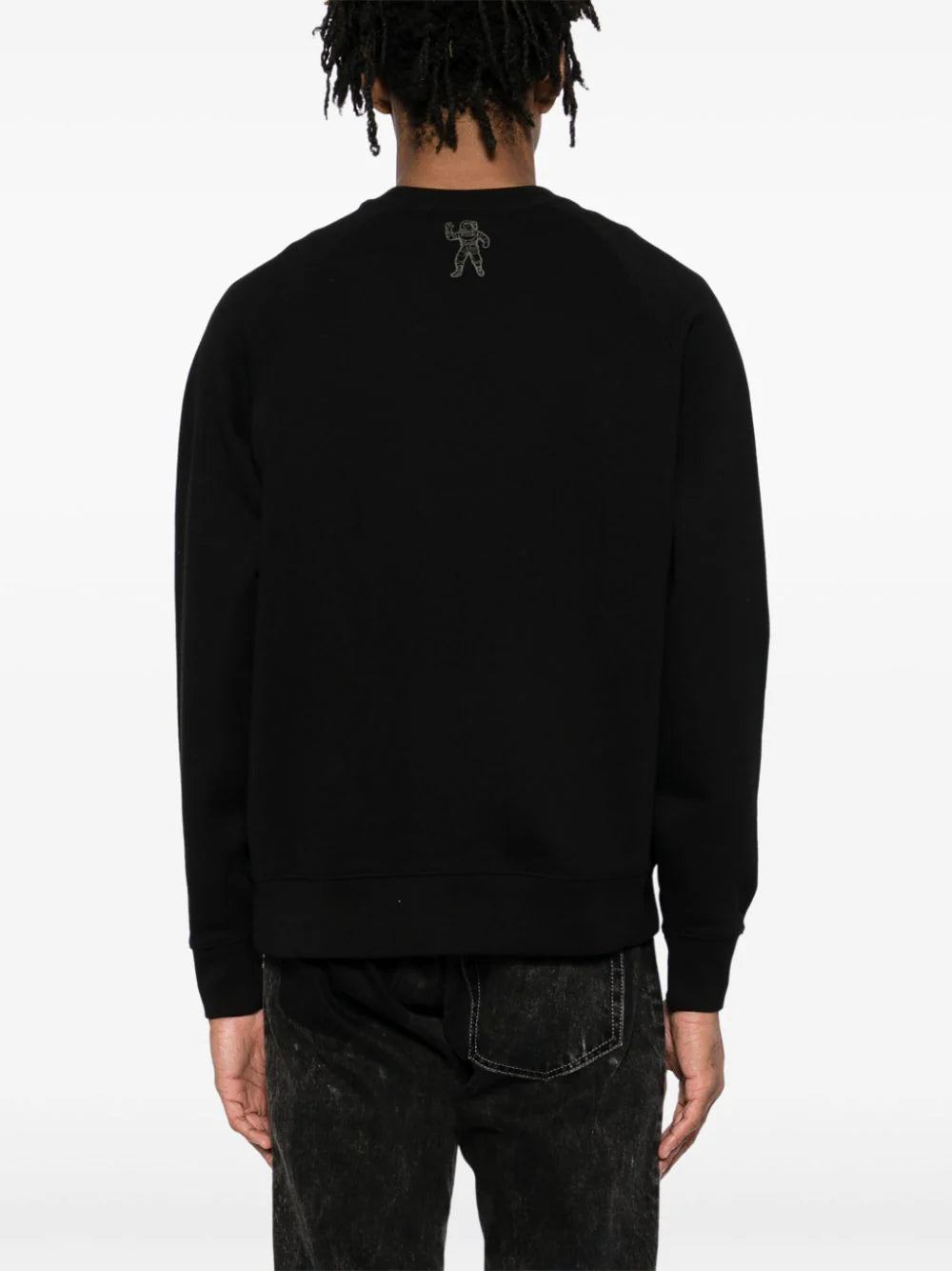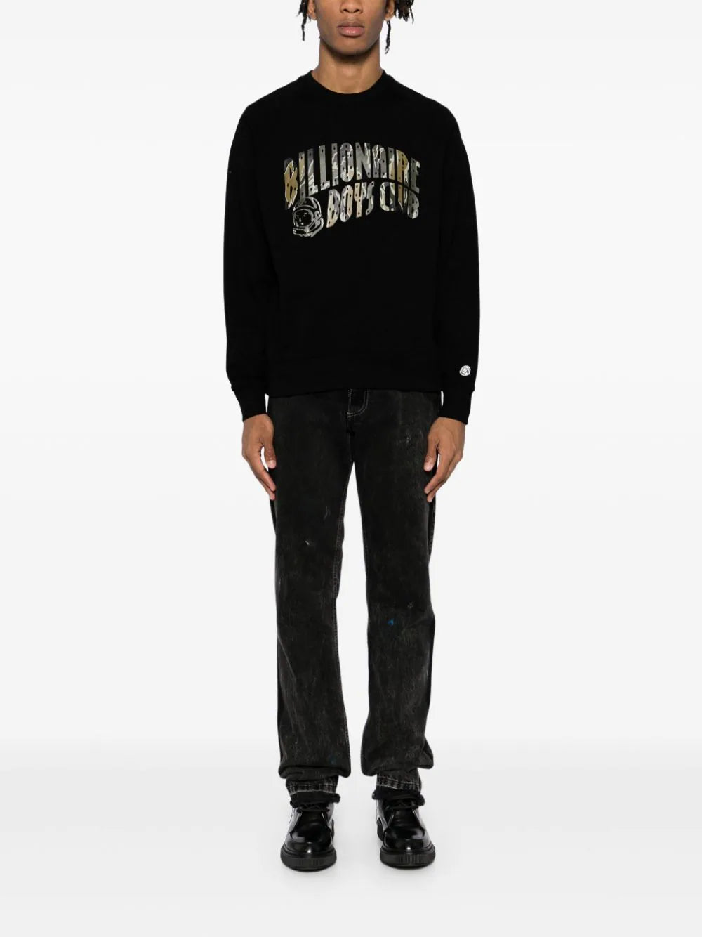 This luxurious sweatshirt boasts a black cotton jersey texture with a unique camouflage pattern and bold logo print on the front. The long raglan sleeves and graphic print on the back add an artistic touch. The ribbed cuffs and hem give a sleek finish to this exclusive piece.