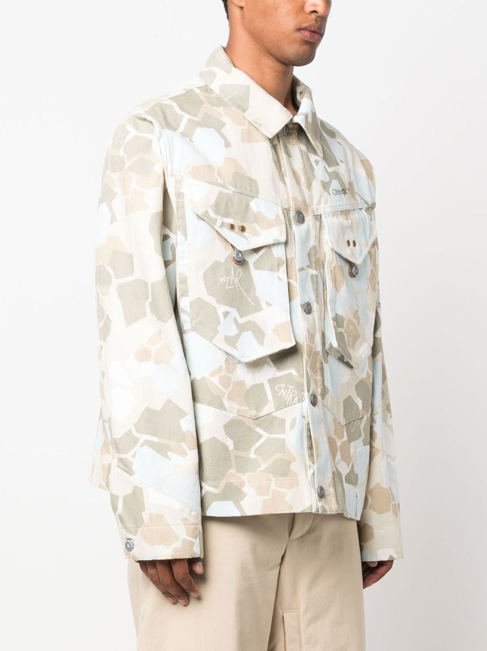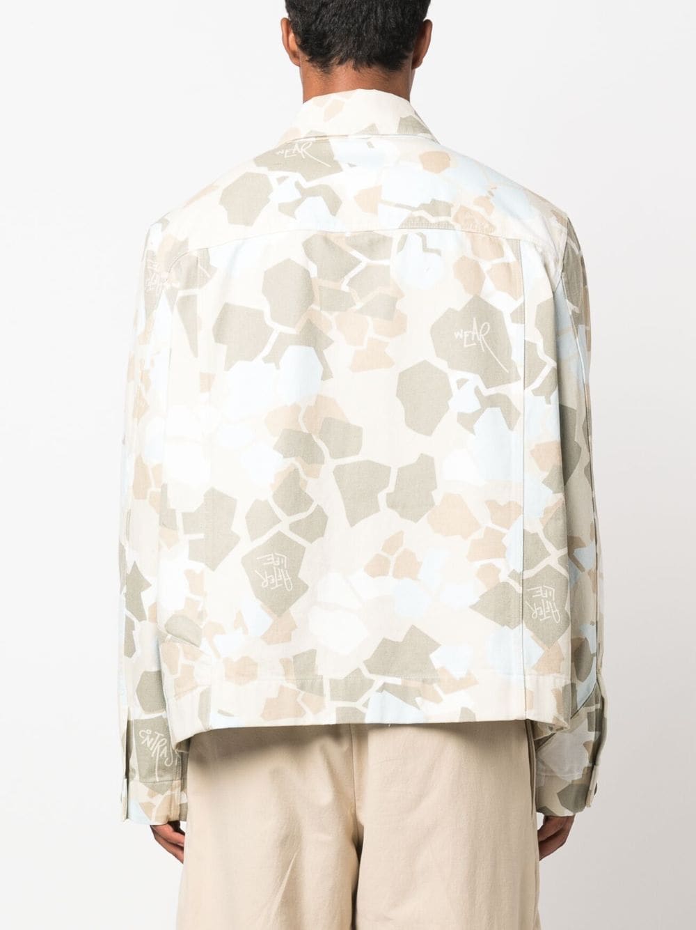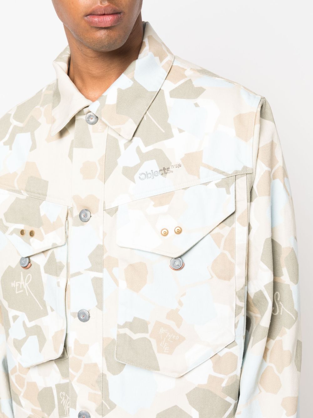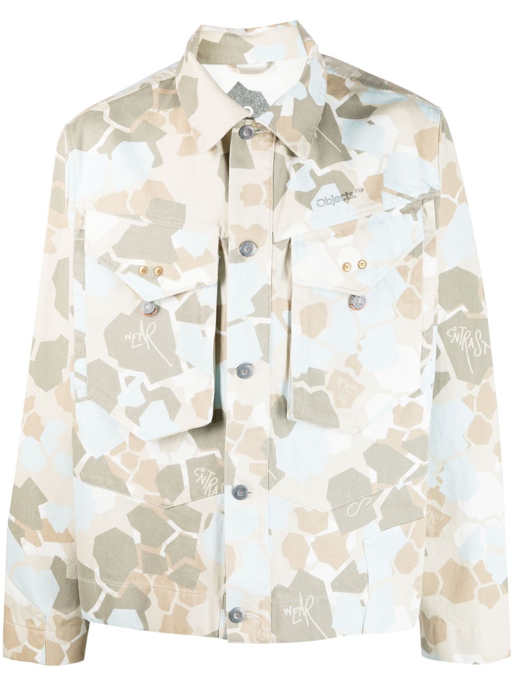 camouflage-pattern denim jacket from OBJECTS IV LIFE featuring beige, multicolour, cotton, denim, camouflage pattern, pointed flat collar, front button fastening, long sleeves, buttoned cuffs, two chest patch pockets and straight hem.