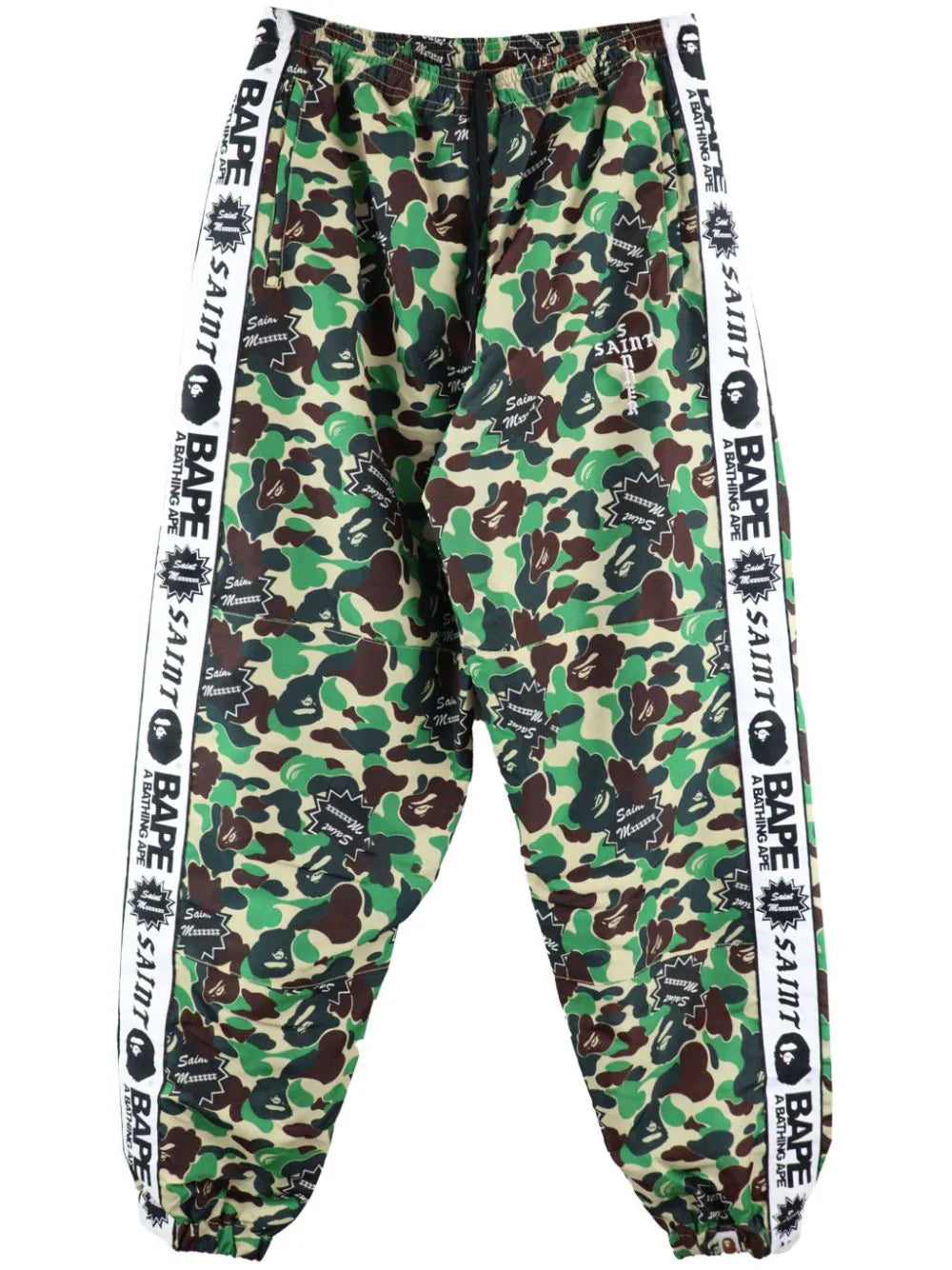 green/black/white camouflage print logo-embellished side panels mid-rise drop crotch wide leg drawstring waist slip pockets to the sides rear zip-fastening pocket elasticated hem