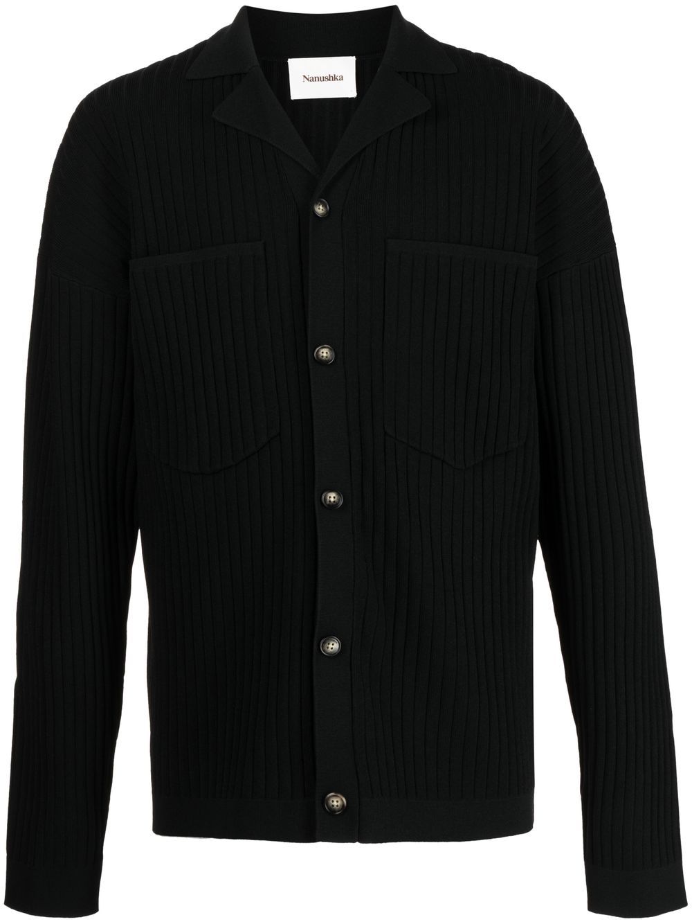 camp collar ribbed cardigan from NANUSHKA featuring black, knitted construction, camp collar, V-neck, ribbed detailing, front button fastening, two front patch pockets and long sleeves.