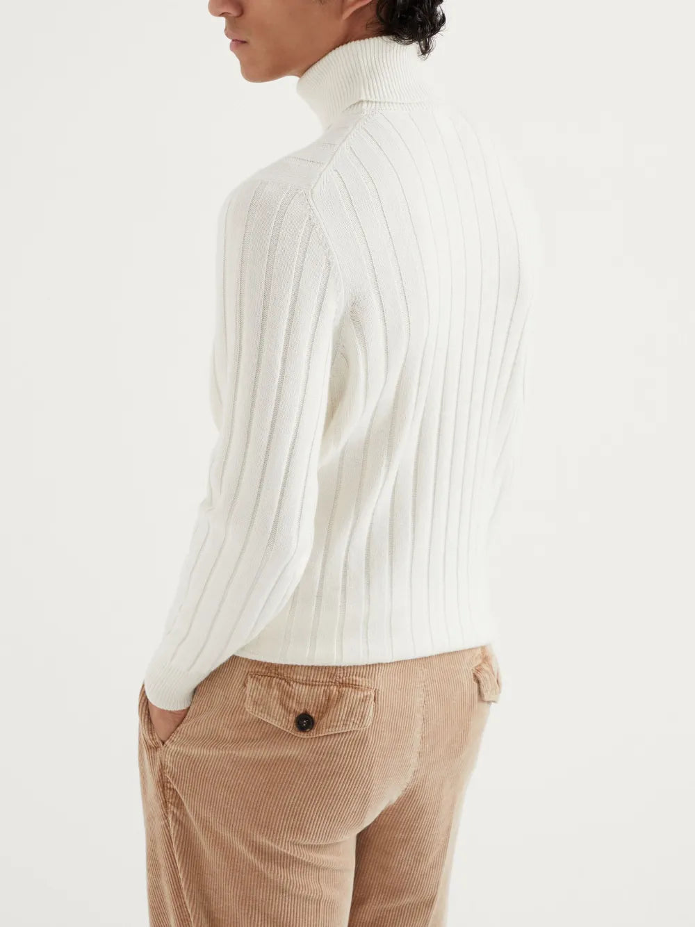 Expertly crafted from soft, luxurious cashmere, this white ribbed knit jumper boasts a timeless roll neck design and long sleeves. The straight hemline adds a classic touch, making it a versatile and elegant wardrobe staple. Stay warm and stylish in this must-have piece.