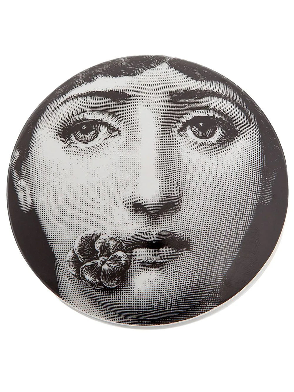 White ceramic box from Fornasetti featuring a matching lid with a print of a woman's face with a flower at the mouth.