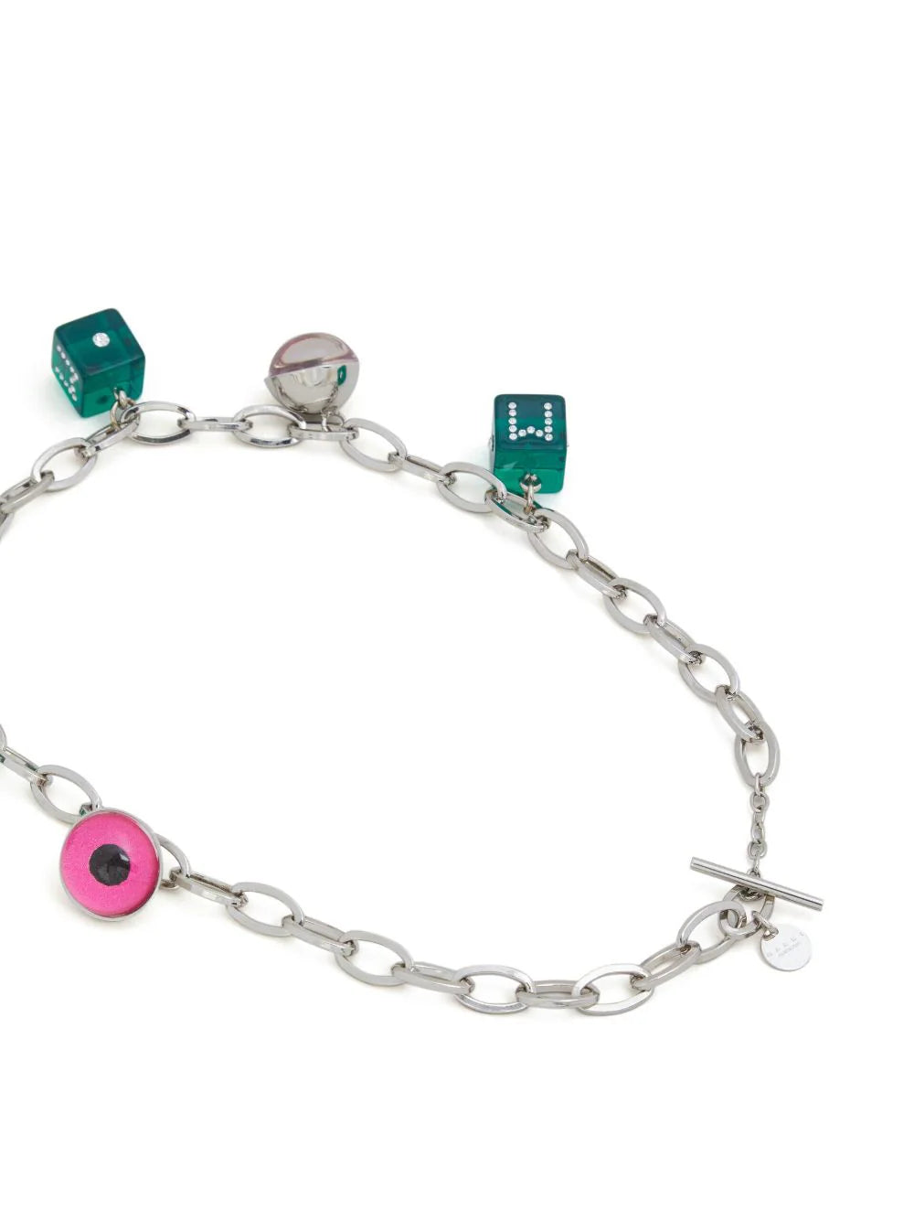 charm-embellished chain necklace from MARNI featuring silver-tone, multicolour, brass, silver-plated hardware, logo charm, spike stud detailing, chain-link detailing and spring-ring fastening.