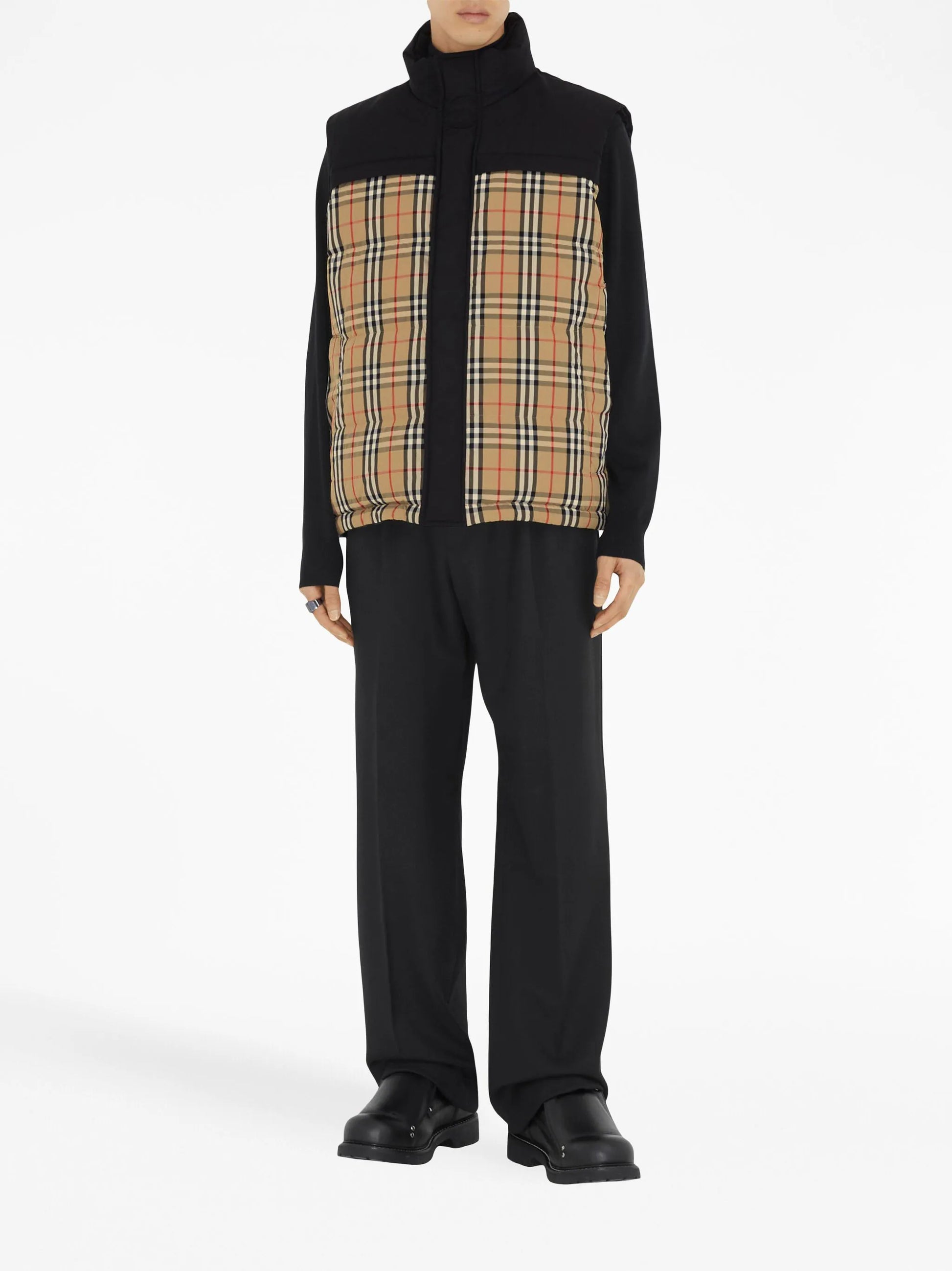 check-print padded gilet from BURBERRY featuring archive beige, goose down, check print, padded design, high neck, concealed front fastening, sleeveless, straight hem and black.
