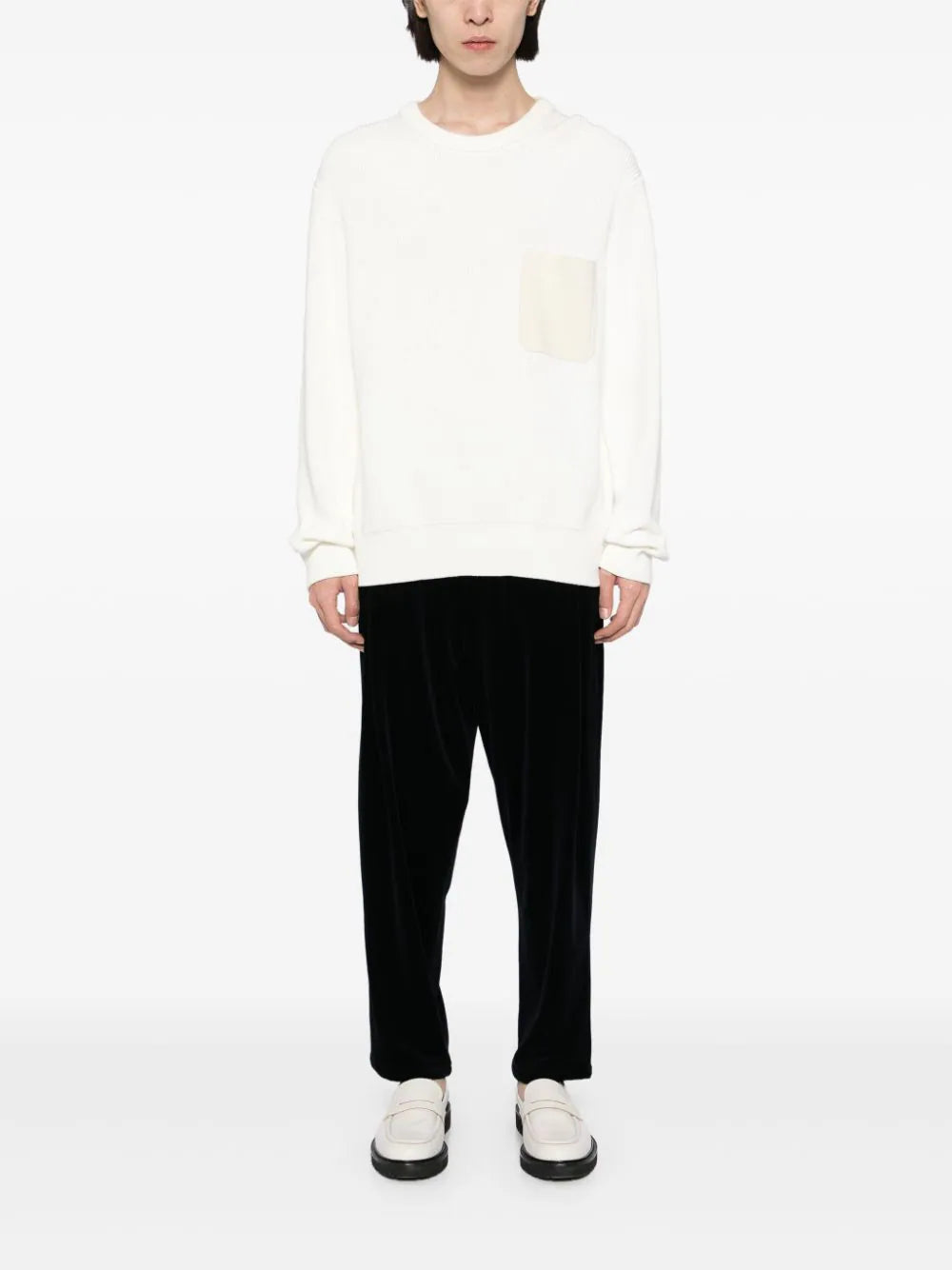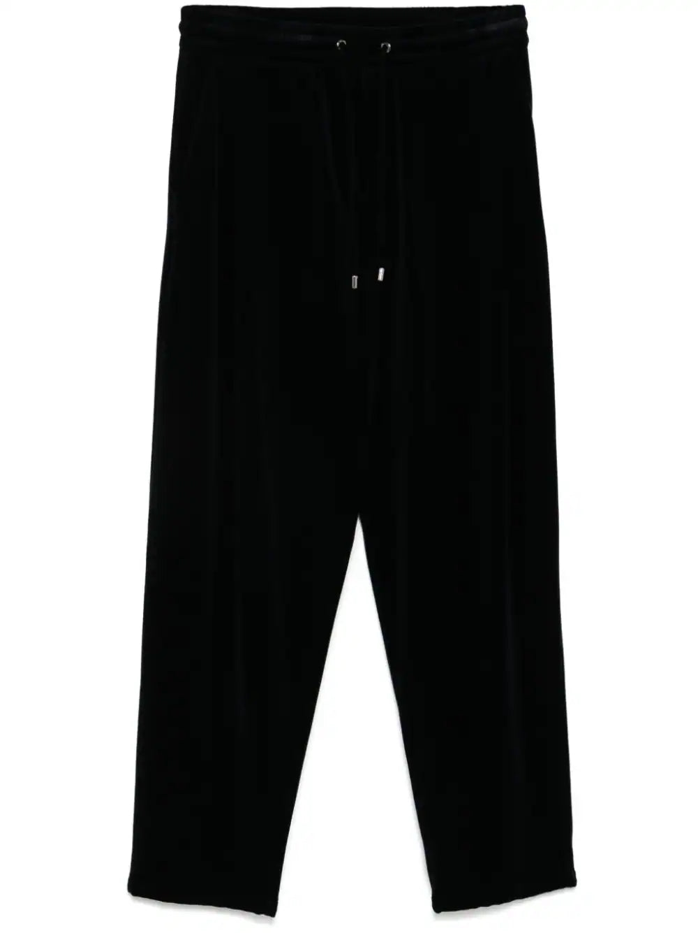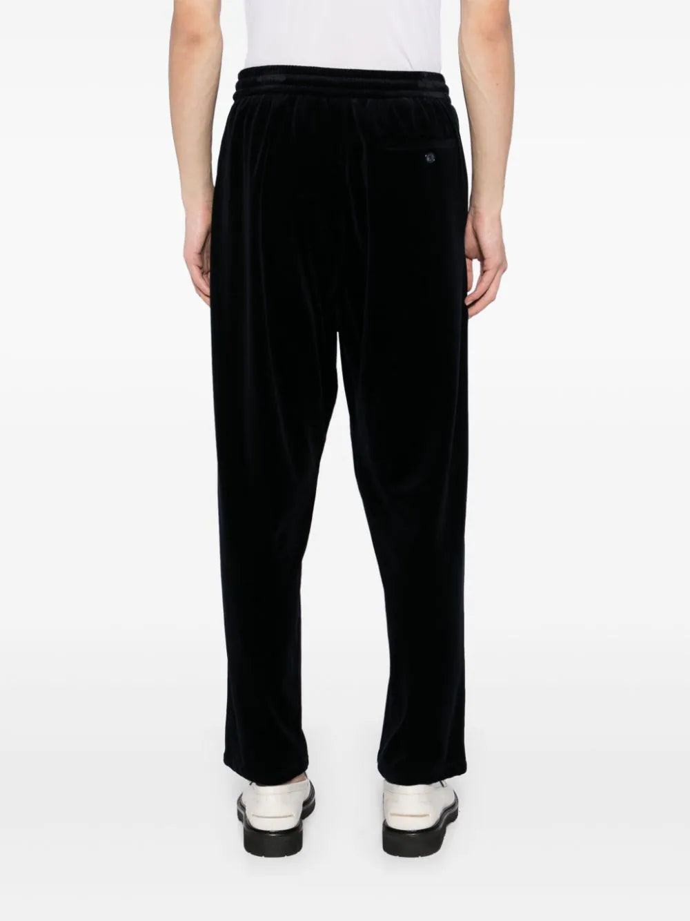 night blue cotton blend chenille texture elasticated drawstring waistband two side slash pockets rear button-fastening pocket straight hem