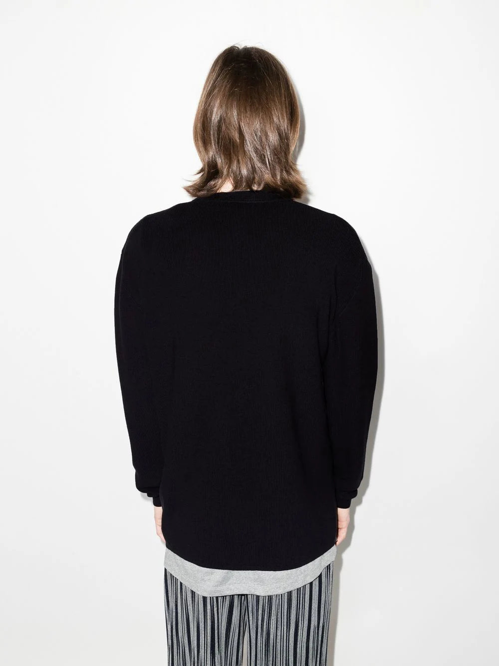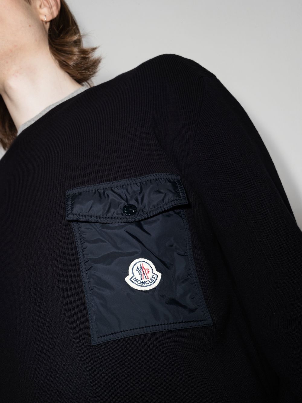 logo-patch ribbed jumper from MONCLER featuring navy blue, cotton, logo patch at the chest, ribbed knit, crew neck, long sleeves and straight hem.