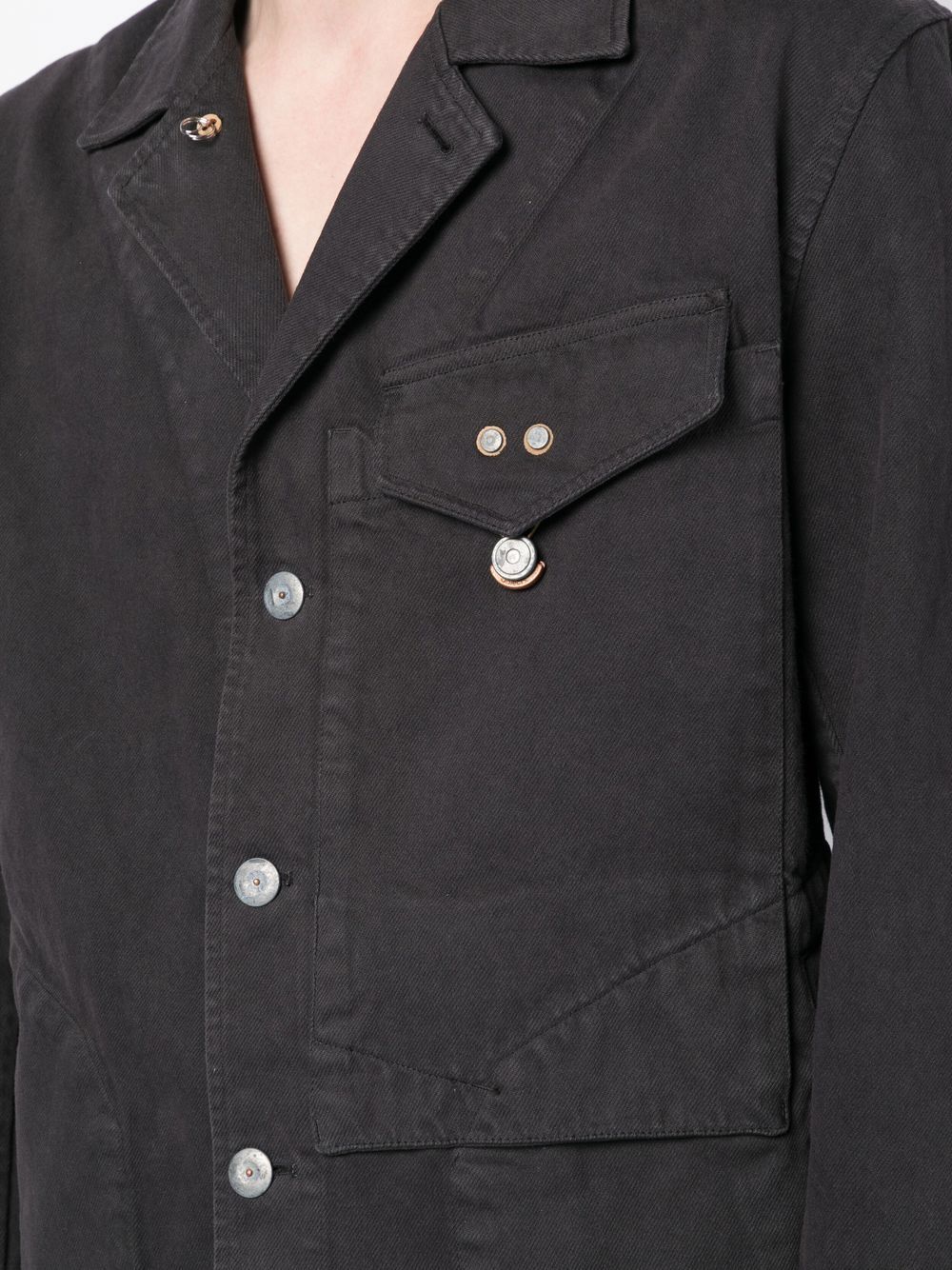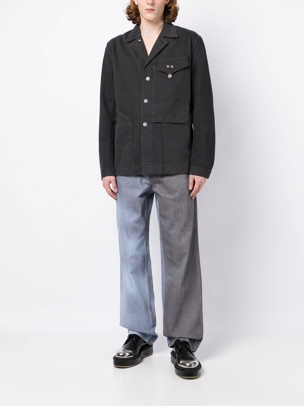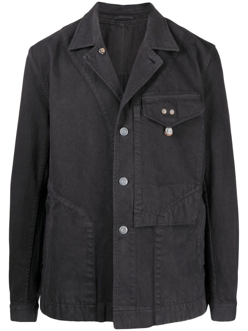 chest-pocket shirt jacket from OBJECTS IV LIFE featuring anthracite grey, organic cotton-recycled polyester blend, notched collar, front button fastening, chest patch pocket and long sleeves.