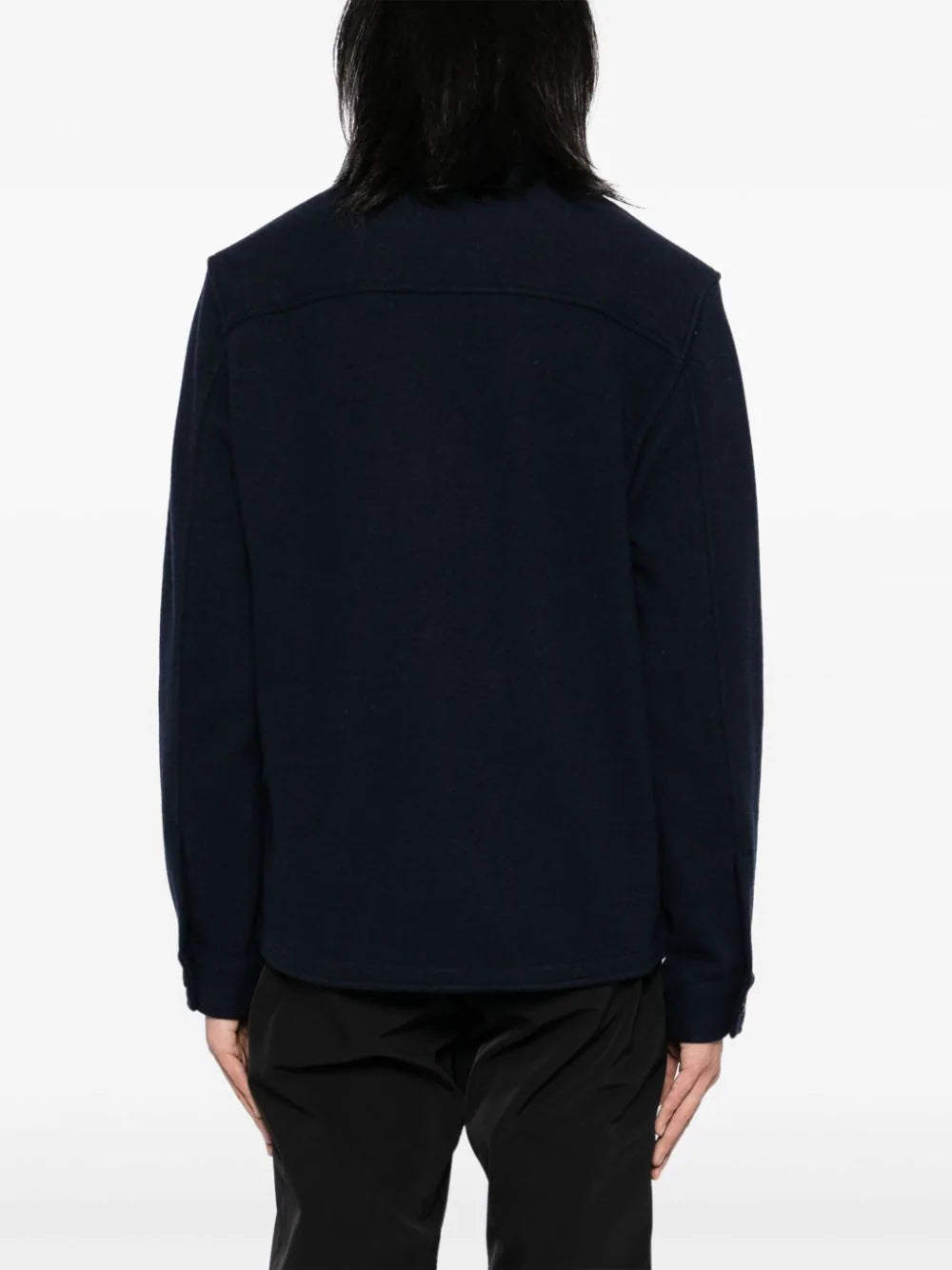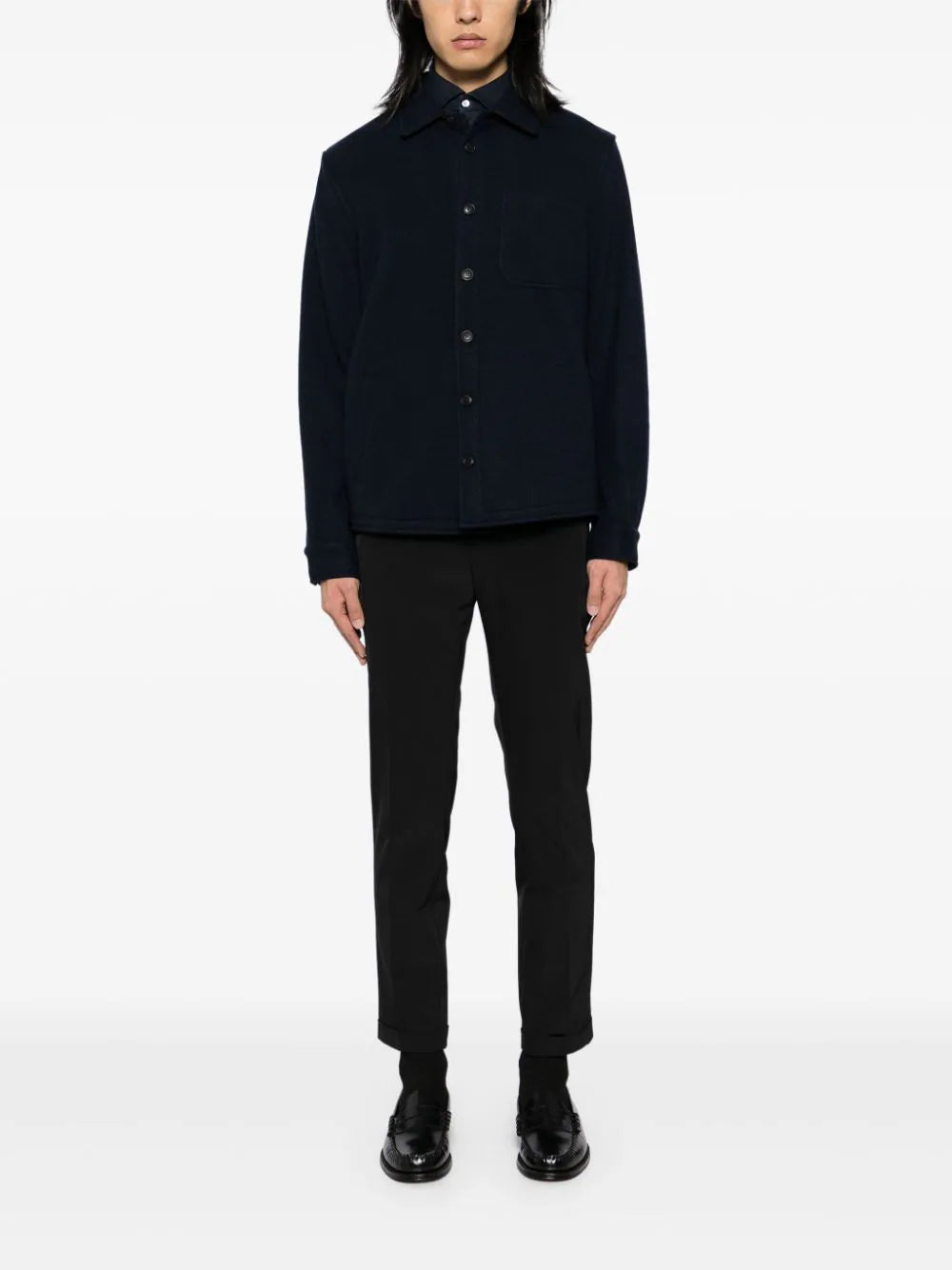 navy blue cashmere flannel front button fastening spread collar long sleeves buttoned cuffs chest patch pocket two front welt pockets curved hem