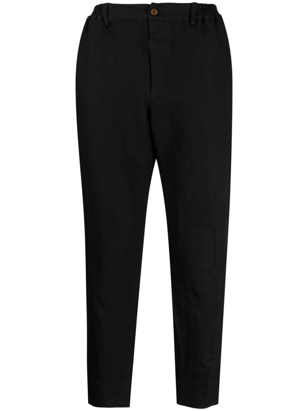 chevron-pattern tapered trousers from BLACK COMME DES GARÇONS featuring black, chevron knit, belt loops, elasticated waistband, front button and zip fastening, tapered leg, two side slit pockets, rear welt pocket and rear flap pocket. When buying this unisex item, keep in mind that it is graded in standard men's sizing..