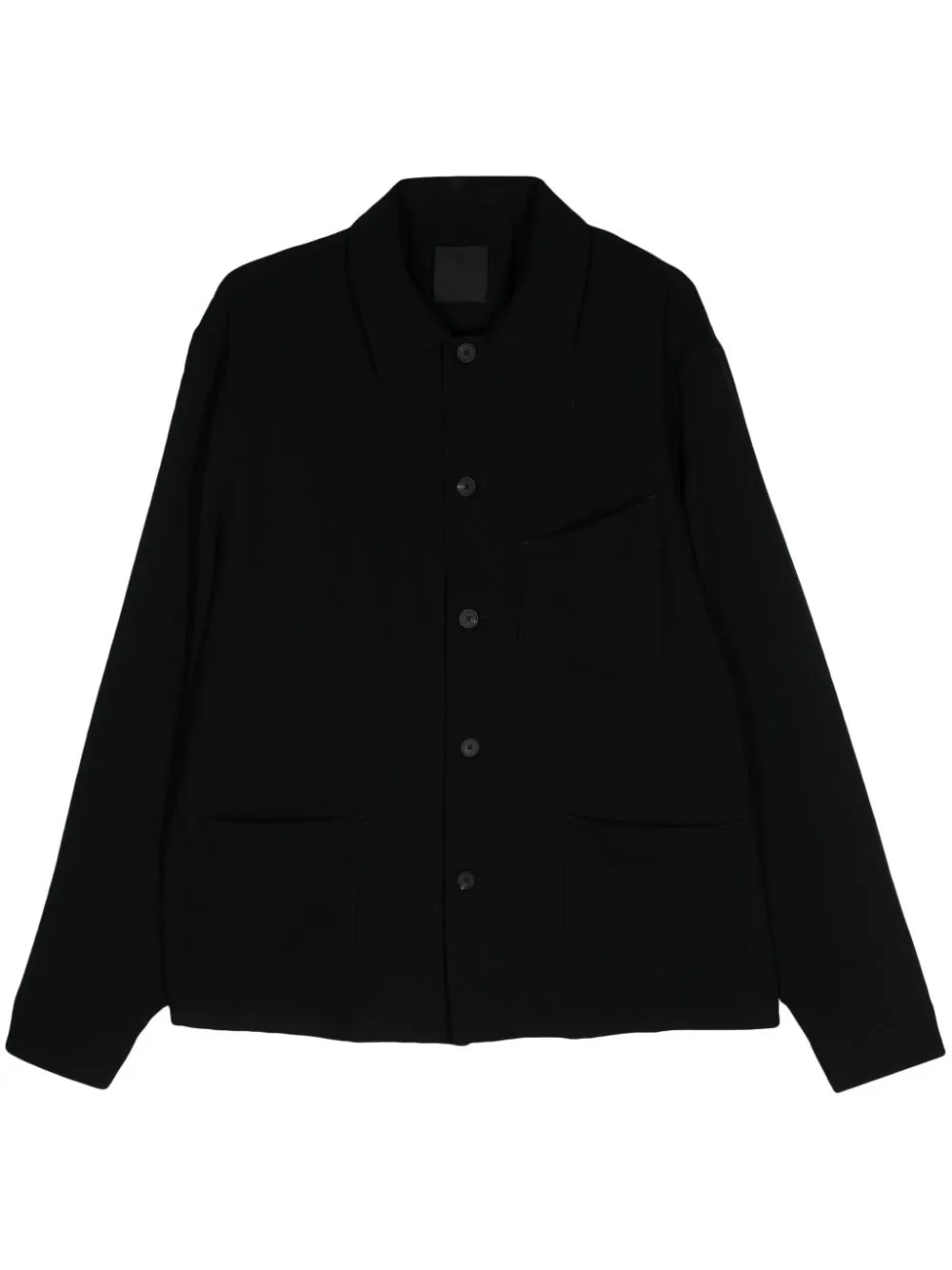 black wool blend classic collar long sleeves with buttoned cuffs chest patch pocket two front patch pockets straight hem front button fastening