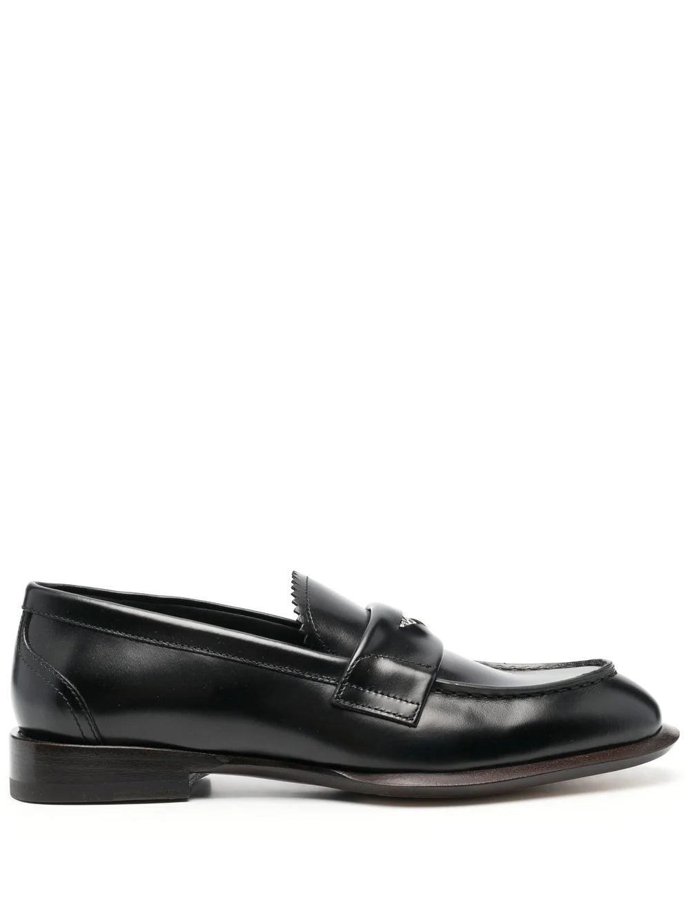 coin-embellished penny loafers from Alexander McQueen featuring black, calf leather, polished finish, stitched-fold detailing, silver-tone hardware, zigzag edge, penny slot, almond toe, branded leather insole and flat rubber sole.