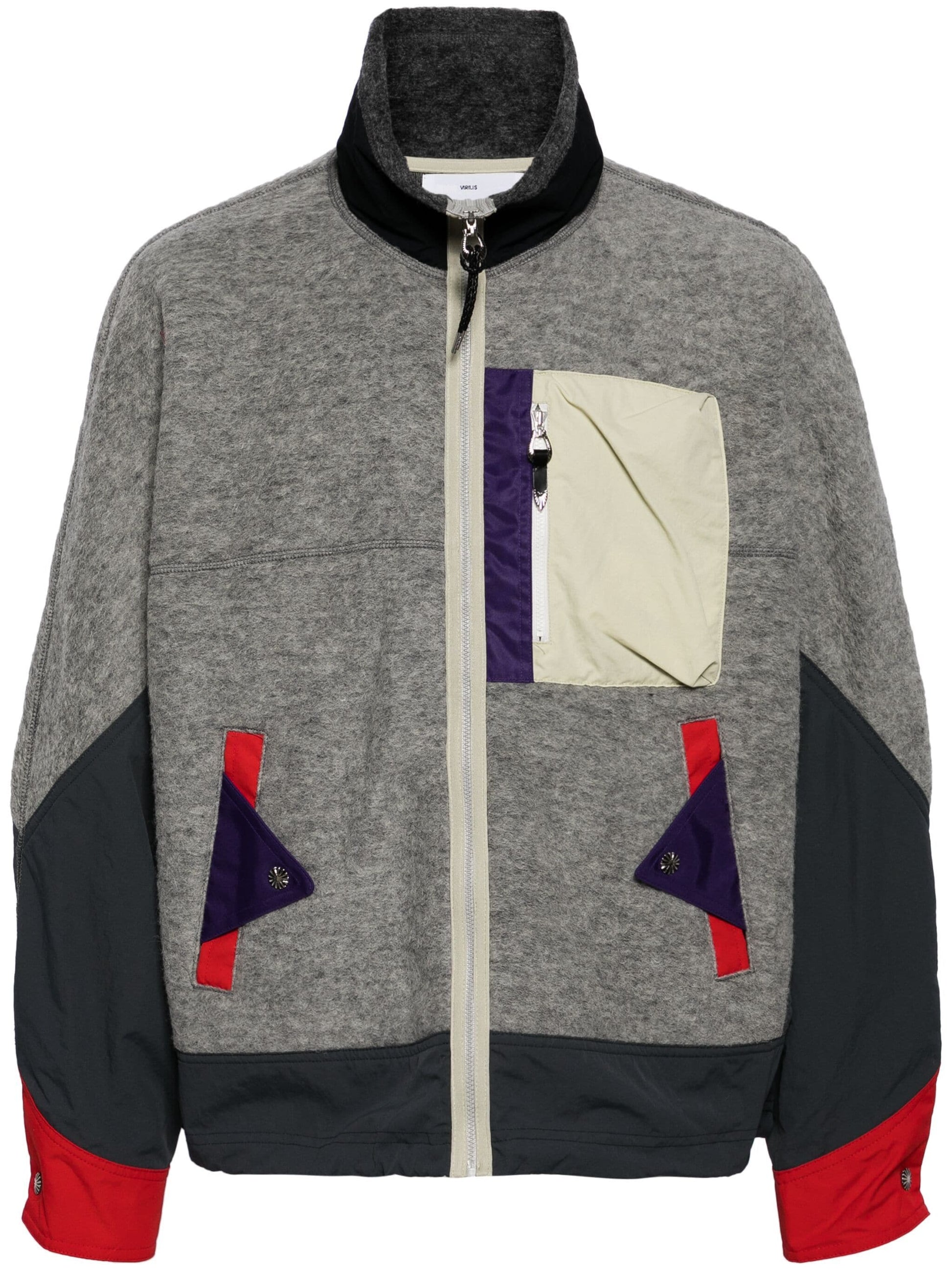 ash grey/multicolour wool blend colour-block panelled design mélange effect stand-up collar front zip fastening zip-fastening chest pocket two side flap pockets long sleeves press-stud fastening cuffs straight hem