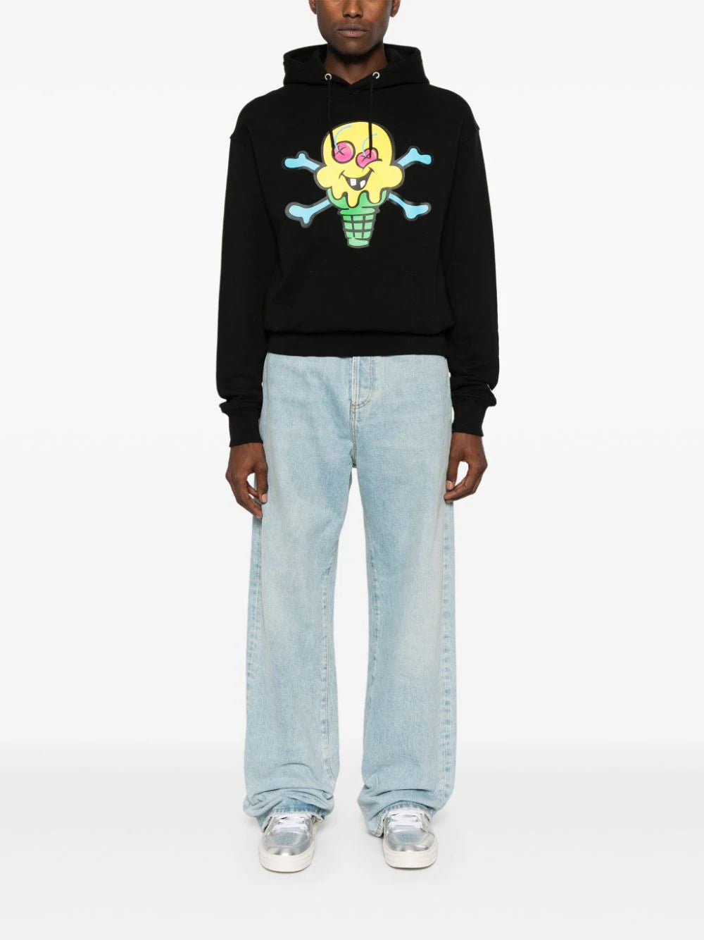black cotton jersey texture Cones & Bones print to the front logo patch at the sleeve drawstring hood drop shoulder long sleeves ribbed cuffs and hem front pouch pocket straight hem French terry lining