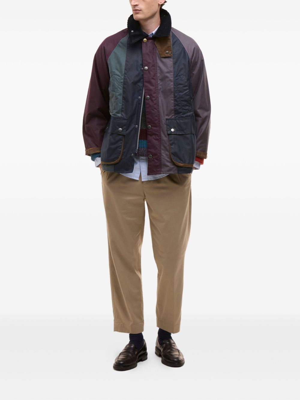 This red Corduroy-Collar Patchwork Jacket features a distinctive patchwork design paired with a textured corduroy collar. Equipped with button fastening, front flap pockets, and long sleeves, it combines classic detailing with practical elements, making it a versatile and stylish outerwear choice.