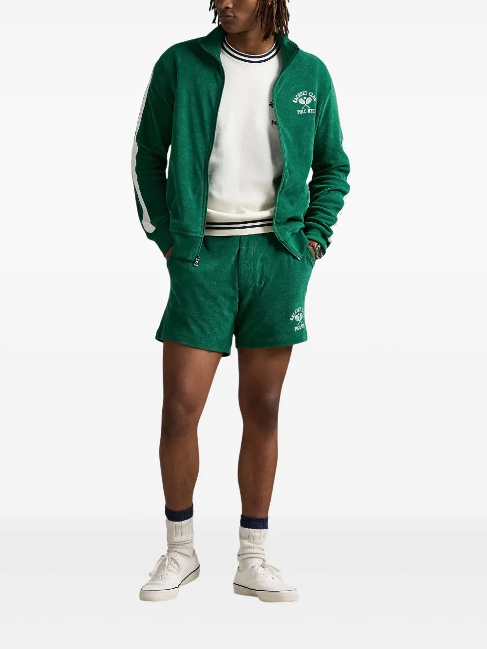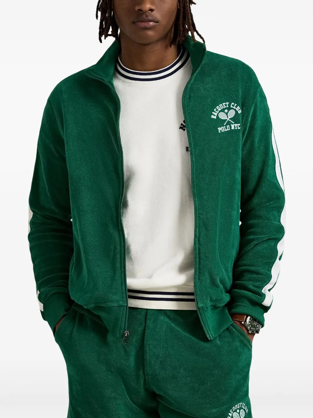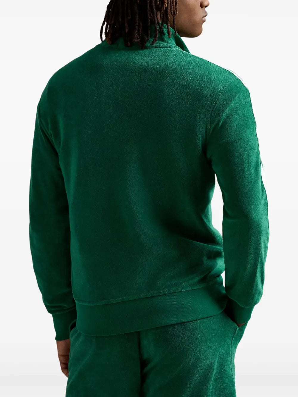 This cotton baseball jacket features a crisp emerald green color and a front zip fastening for easy wear. With two side zip-fastening pockets and embroidered logo at the chest, it combines style and practicality. The side stripe detailing adds a touch of sporty elegance. Expertly crafted for comfort and durability.