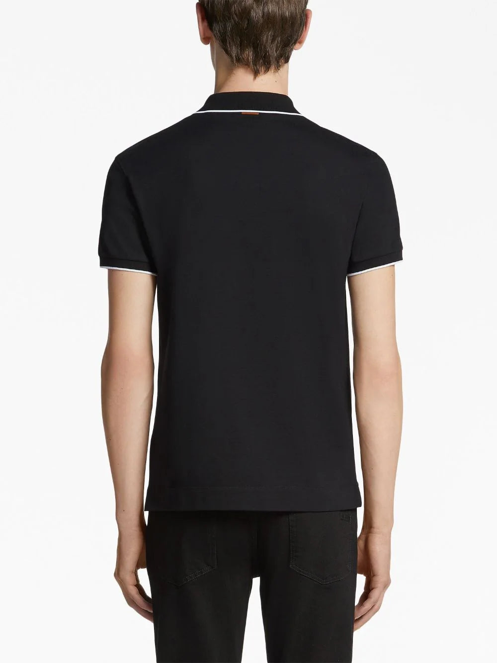 black stretch-cotton embroidered logo at the chest striped edge polo collar front button placket short sleeves straight hem