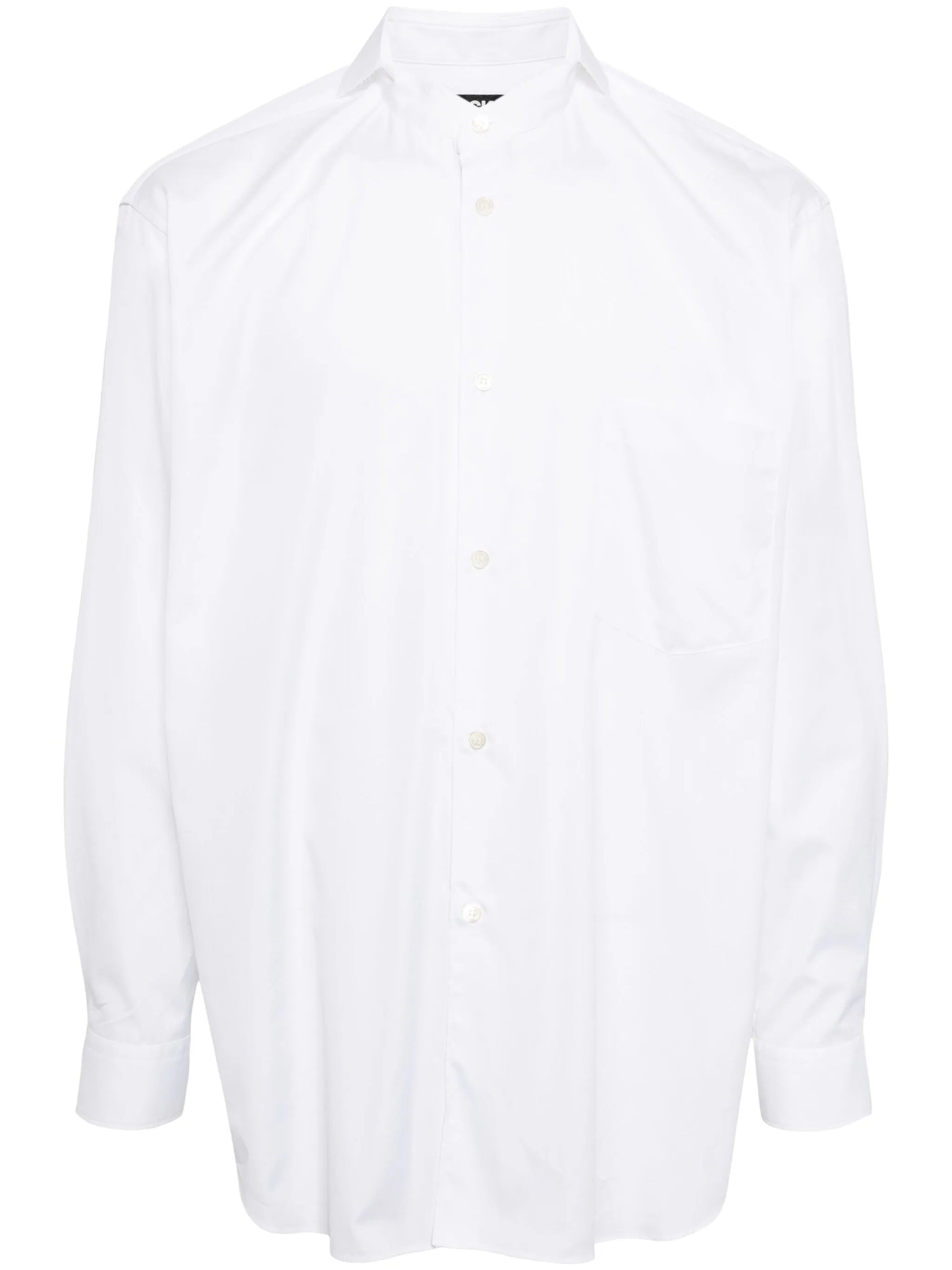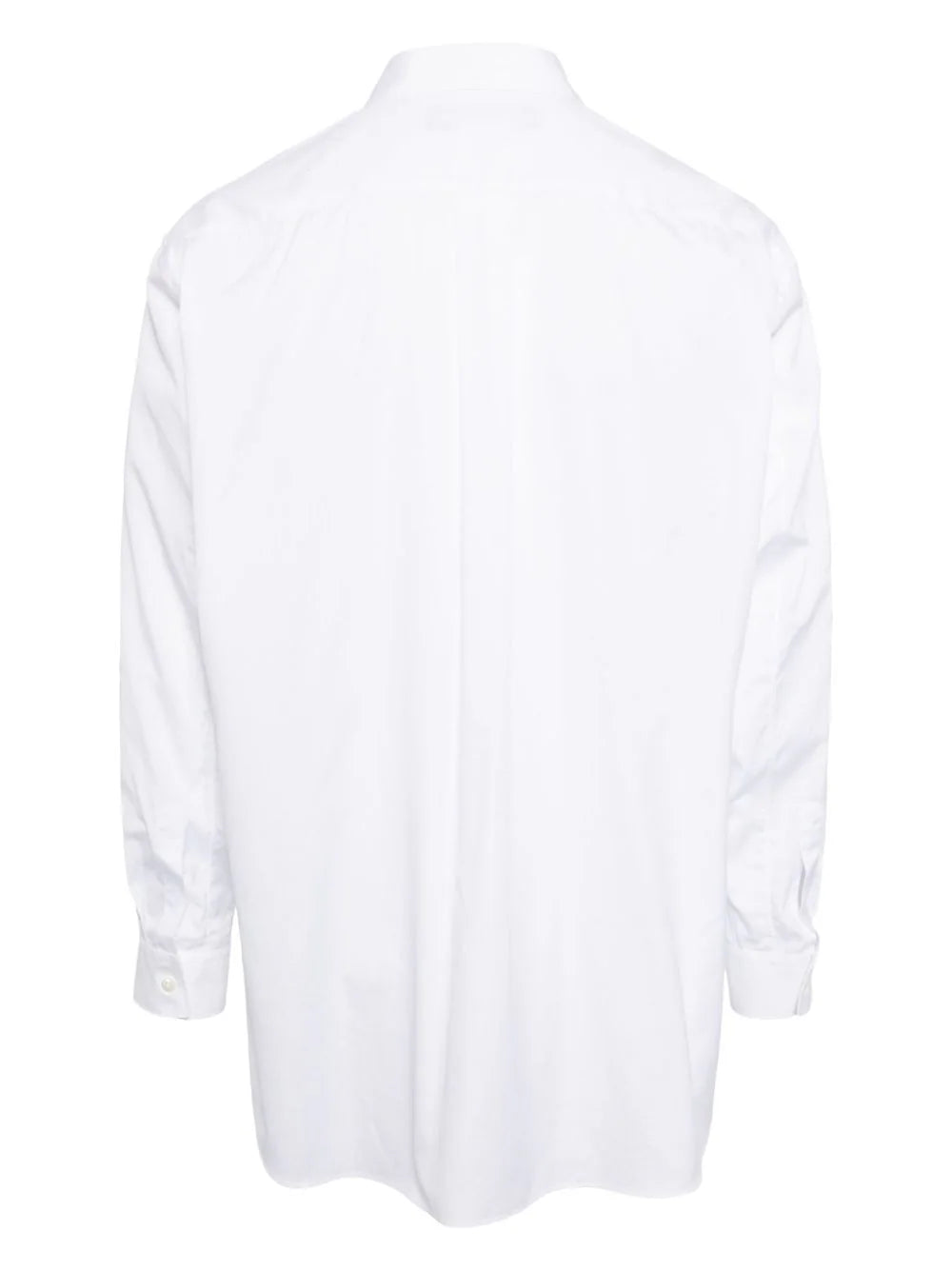optical white cotton poplin texture asymmetric collar long sleeves buttoned cuffs curved hem front button fastening
