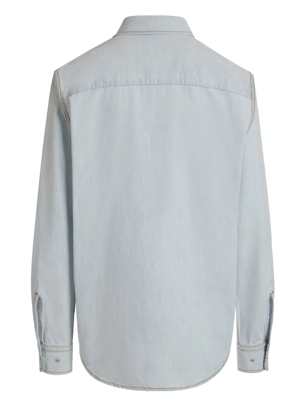 This denim shirt features a blue front button fastening, logo patch on the front, and long sleeves. Made with sturdy denim material, this shirt offers a classic look with a modern twist. Stay stylish and comfortable with this versatile wardrobe staple.