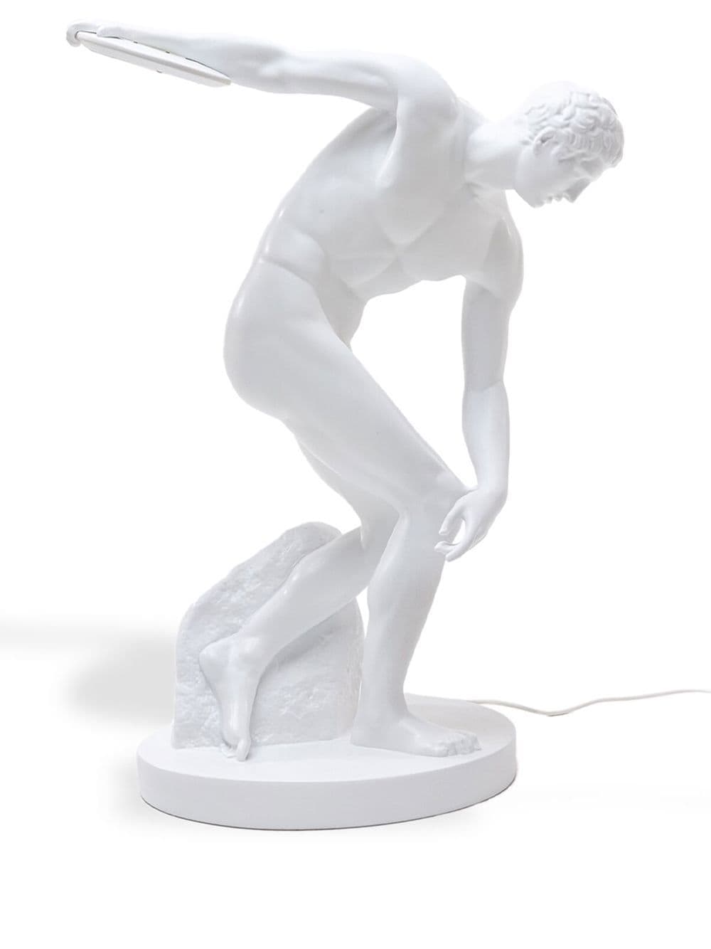 Discobolux table lamp from SELETTI featuring white, discus thrower sculpted design, plug in and UK plug.