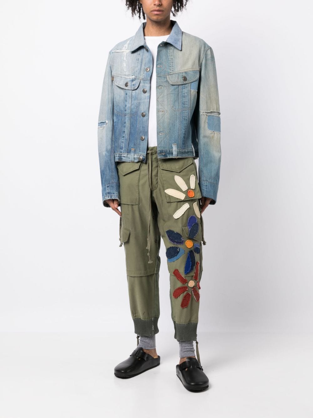 distressed-effect denim jacket from GREG LAUREN featuring blue, cotton, washed denim, distressed effect, classic collar, front button fastening, long sleeves, buttoned cuffs and two button-fastening chest pockets.