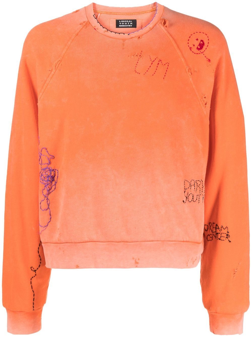 distressed-effect embroidered sweatshirt from Liberal Youth Ministry featuring orange, cotton blend, gradient effect, embroidered design, distressed finish, crew neck, long sleeves and elasticated trim.