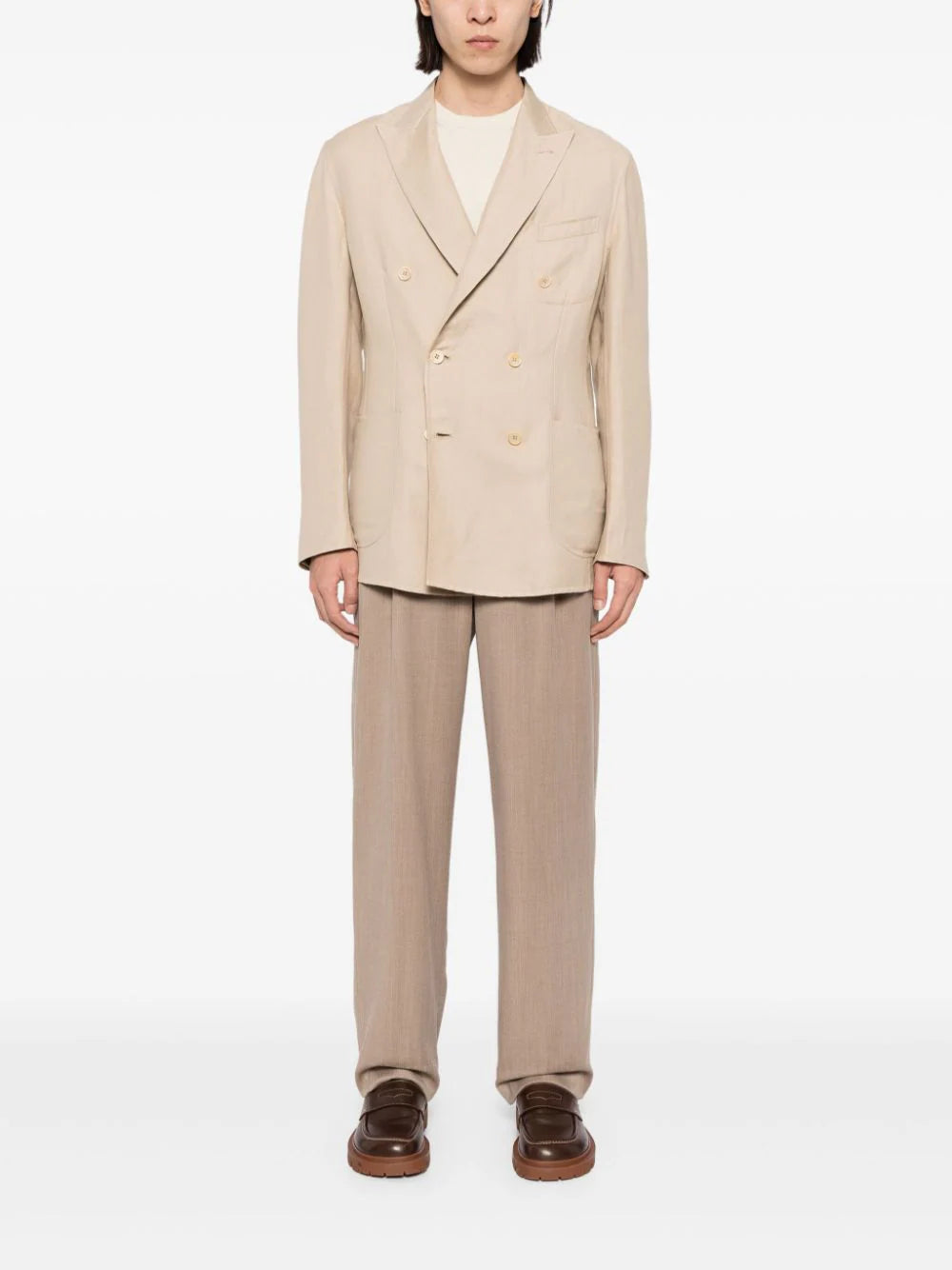 light beige linen-wool-silk blend slub texture dart detailing peak lapels double-breasted button fastening long sleeves buttoned cuffs chest welt pocket two front patch pockets internal patch pocket English rear vents straight hem full lining