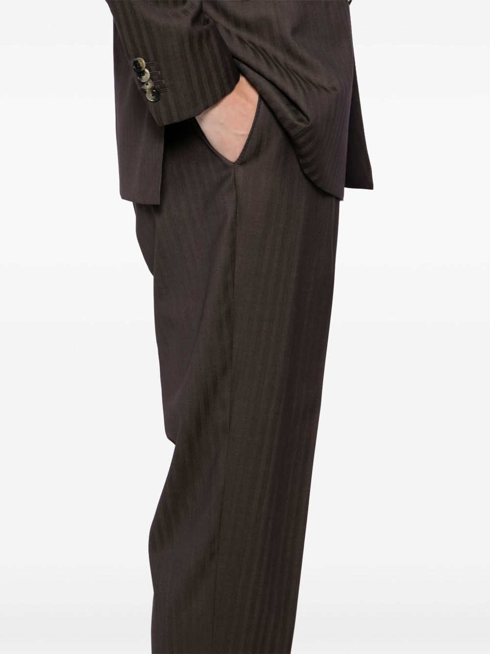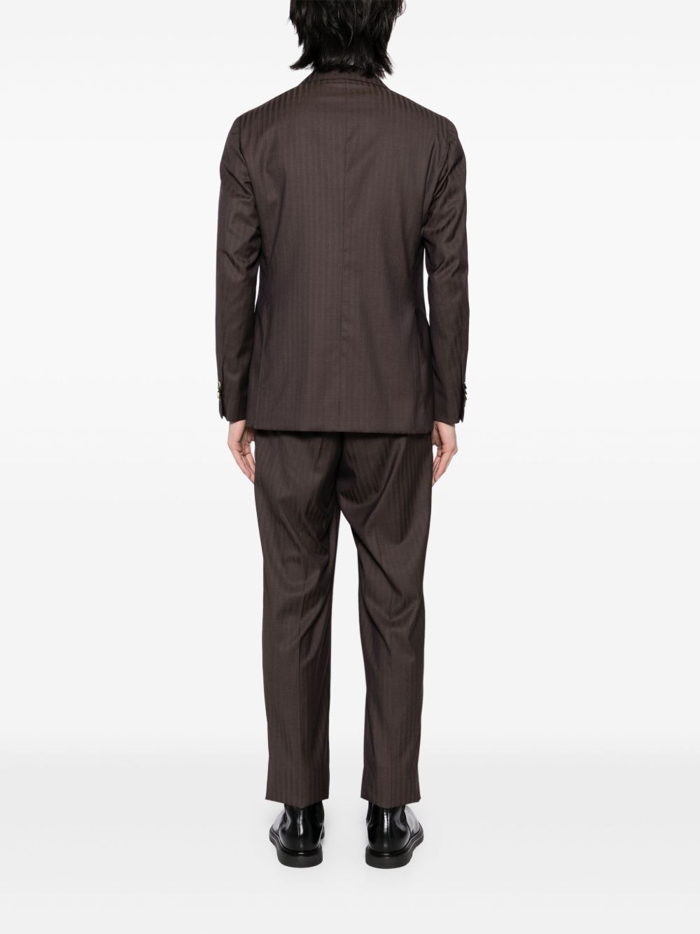 This dark brown double-breasted suit boasts a classic appeal with a modern twist. With a secure button fastening and buttoned cuffs, this suit exudes sophistication and style. The pants feature a front button and zip fastening, as well as two side welt pockets for added convenience. Elevate your professional wardrobe with this sleek and versatile suit.