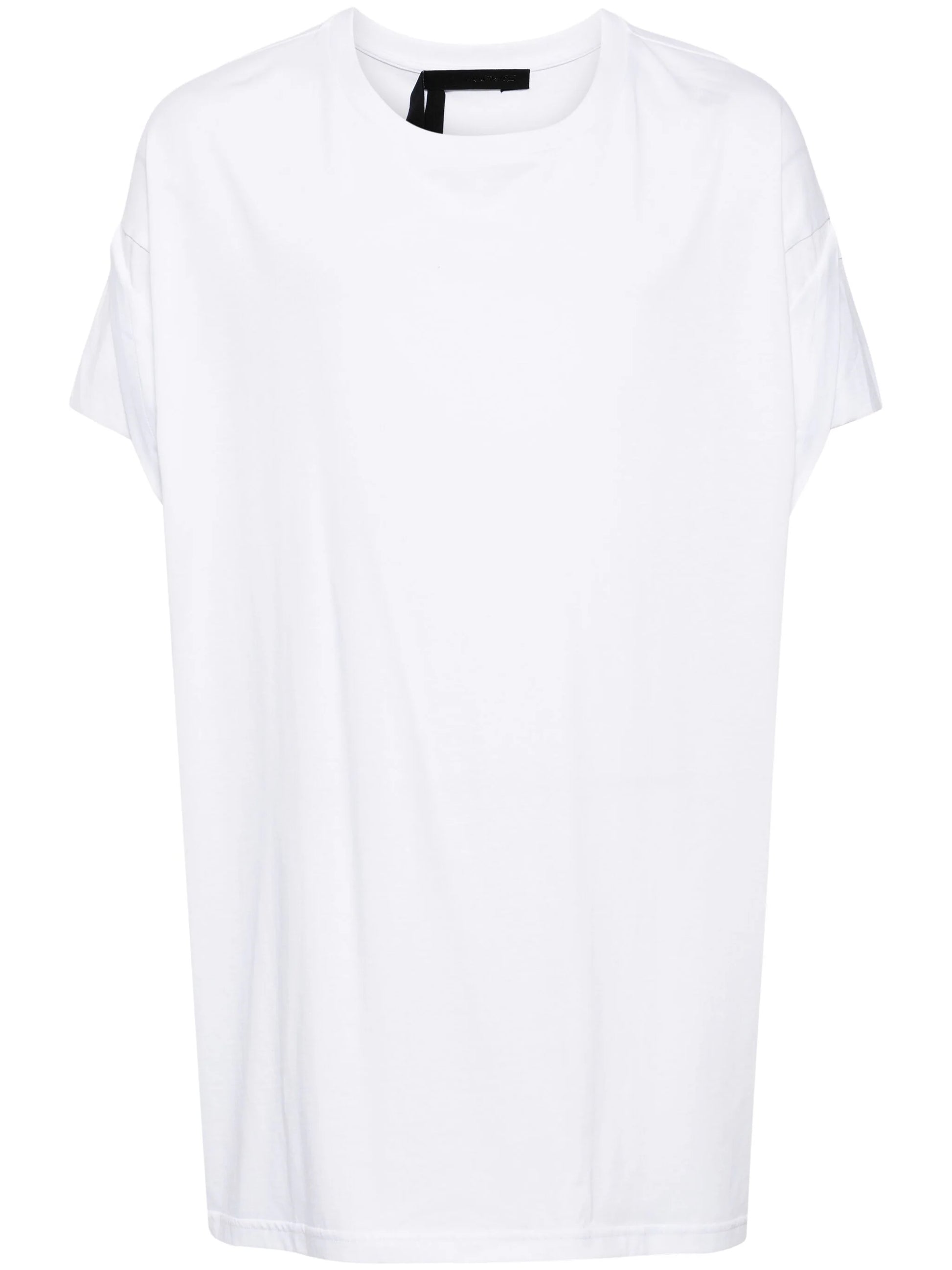 optical white cotton jersey texture draped detailing crew neck drop shoulder short sleeves straight hem
