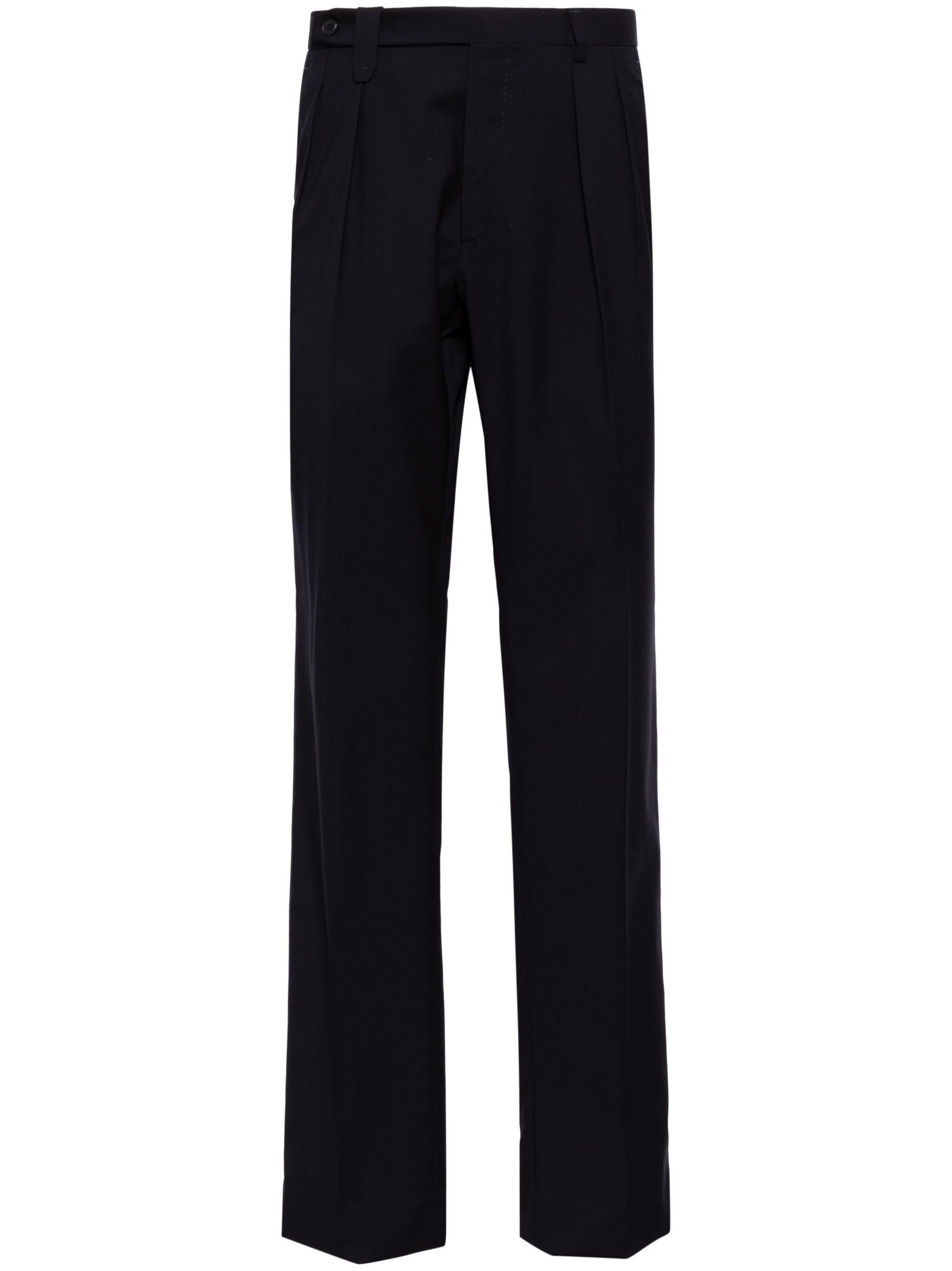 Expertly crafted for the modern professional, the Elba Trousers feature a midnight blue wool blend and a concealed front button, hook and zip fastening. These trousers also offer the convenience of belt loops, two diagonal pockets, and two rear button-fastening jetted pockets. The tapered leg and pressed crease create a polished look, while the unfinished hem allows for a customizable fit.