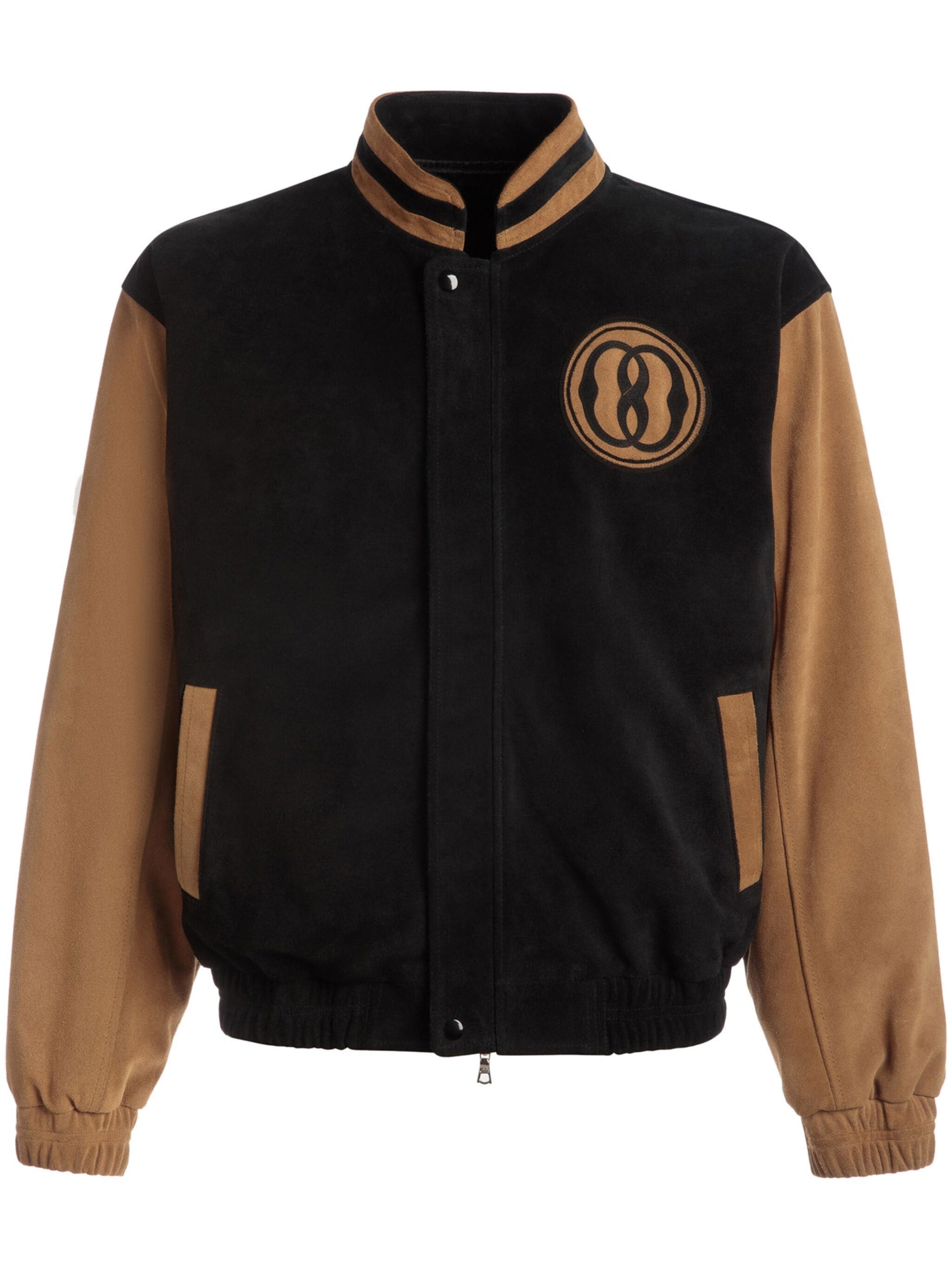 Emblem logo-patch suede bomber jacket from BALLY featuring black, camel brown, suede, logo patch at the chest, Bally Emblem motif, striped edge, stand-up collar, front press-stud fastening, concealed front zip fastening, long sleeves, elasticated cuffs, two side slit pockets and elasticated hem.