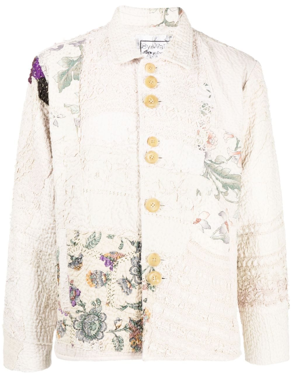 embroidered-patchwork cotton shirt jacket from By Walid featuring cream white, multicolour, cotton, floral print, all-over motif embroidery, patchwork design, contrast stitching, spread collar, front button fastening, long sleeves and straight hem.