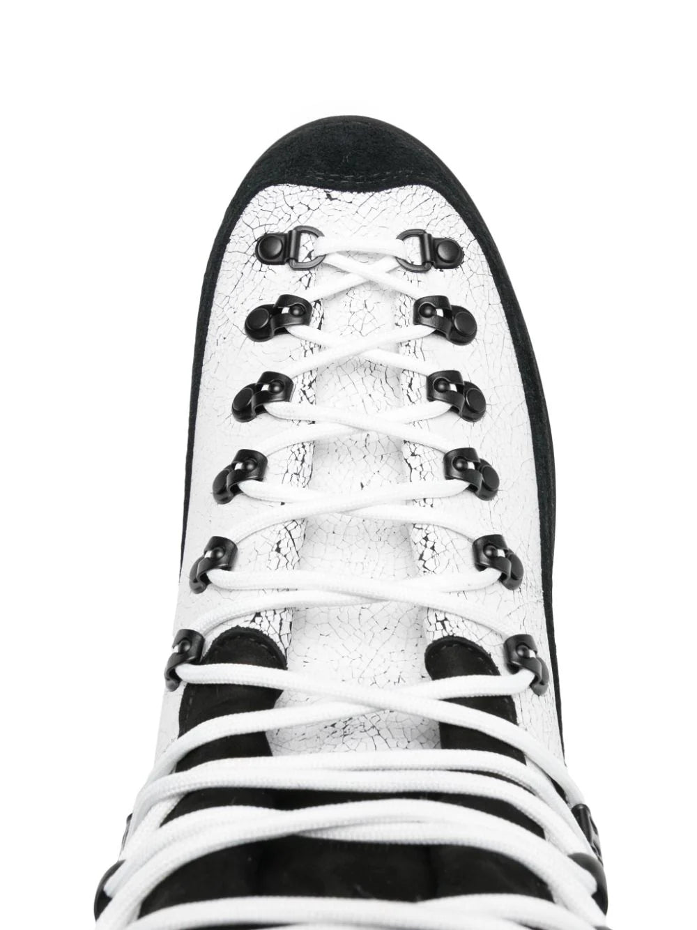 white/black calf leather two-tone design crinkled finish logo stamp to the side pull-tab at the tongue pull-tab at the heel padded ankle round toe front lace-up fastening branded insole ridged rubber sole