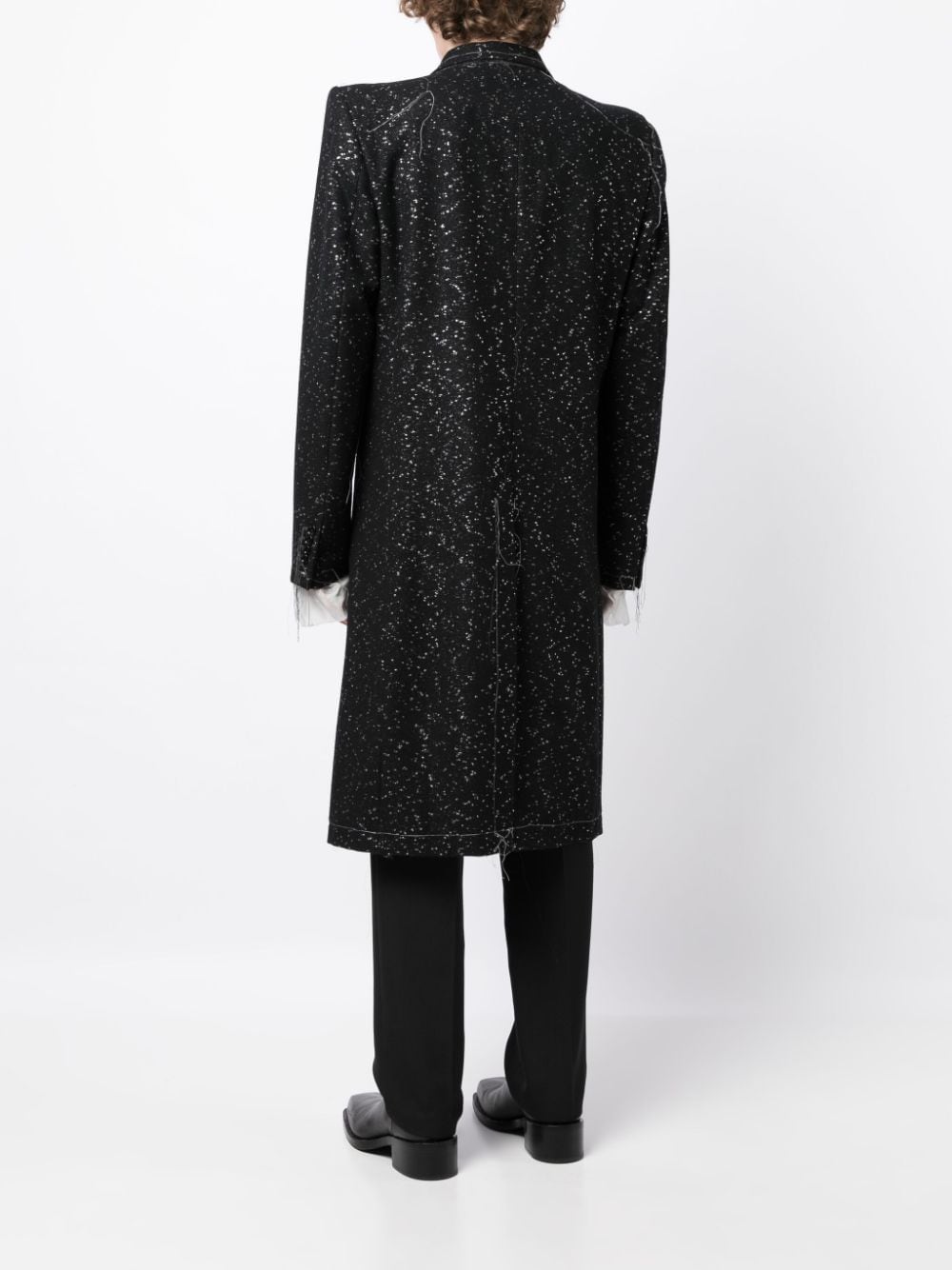 exposed-seam single-breasted coat from NICOLAS ANDREAS TARALIS featuring black/white, silver-tone, wool blend, exposed-seam detailing, notched lapels, front button fastening, shoulder pads, long sleeves, jetted chest pocket, two front flap pockets, straight hem and below-knee length.