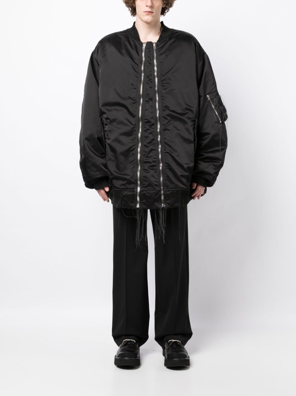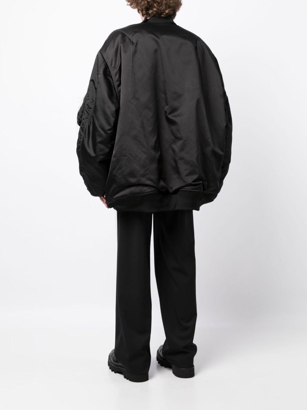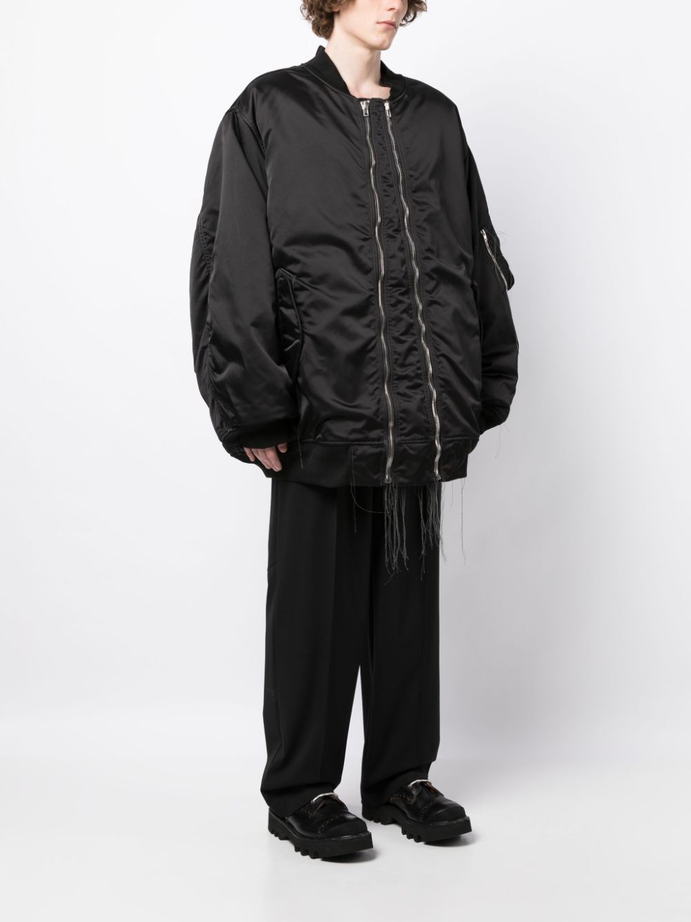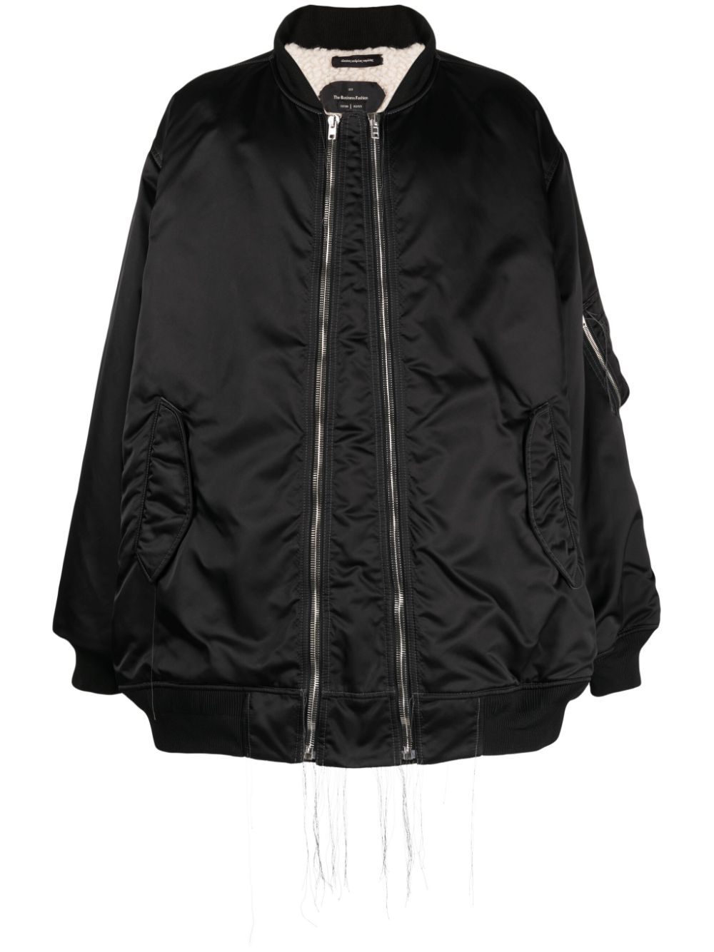 exposed-seam zip-up bomber jacket from NICOLAS ANDREAS TARALIS featuring black, satin finish, exposed-seam detailing, ribbed band collar, front zip fastening, drop shoulder, long sleeves, ribbed cuffs and hem, sleeve zip pocket, two press-stud fastening side pockets and straight hem.